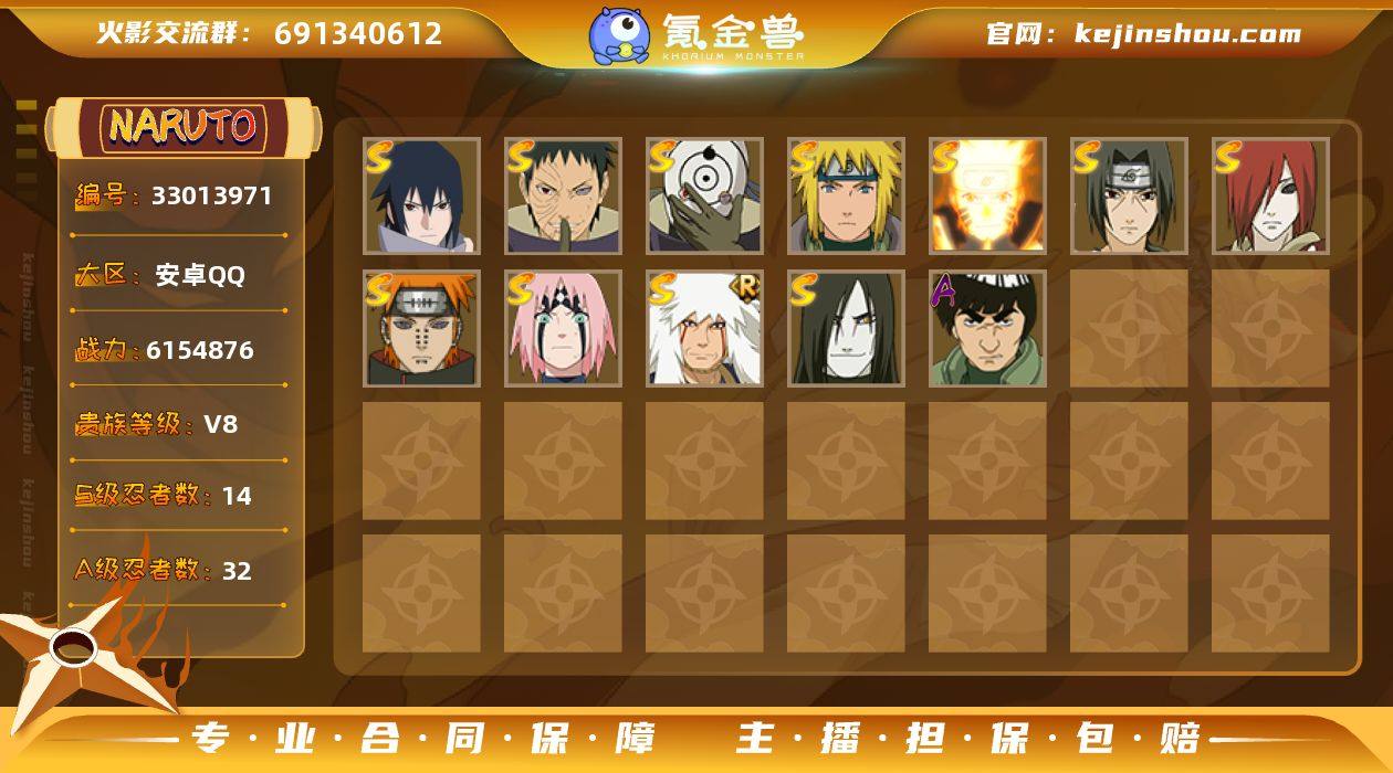 安卓QQ-v8-上忍-615w战力成品号-到手即可畅玩,买到就是赚到-宇智波带土「忍界大战」-宇智波带土「十尾人柱力」-宇智波斑「五影会谈」-漩涡鸣人「九喇嘛连结」-波风水门「新春限定」-宇智波带土「暴怒」-黑绝-小南「神驹佑将」-S忍者数:14- A忍者数:32 【S级忍者】宇智波带土「忍界大战」(3星),宇智波佐助「永恒万花筒」(3星),春野樱「忍界大战」(3星),长门「秽土转生」(3星),漩涡鸣人「九喇嘛连结」(3星),宇智波斑「白面具」(3星),自来也「舞之豪杰」(3星),宇智波带土「十尾人柱力」(3星),宇智波鼬「须佐能乎」(3星),漩涡鸣人·宇智波佐助(3星),佩恩「天道」(3星),宇智波斑「五影会谈」(3星),波风水门(3星),大蛇丸(3星), 【A级忍者】宇智波佐助「须佐能乎」(2星),宇智波带土「暴怒」(2星),大蛇丸「晓」(2星),波风水门「新春限定」(2星),猿飞木叶丸(2星),千代「近松十人卫」(2星),黑绝(2星),我爱罗「忍界大战」(2星),秋道丁次「忍界大战」(2星),宇智波泉奈(2星),照美冥「五代目水影」(2星),志村团藏(2星),干柿鬼鲛(5星),猿飞阿斯玛(5星),迈特凯(5星),蝎(3星),迪达拉(2星),我爱罗「疾风传」(3星),飞段(3星),飞段「死司凭血」(2星),波风水门「...