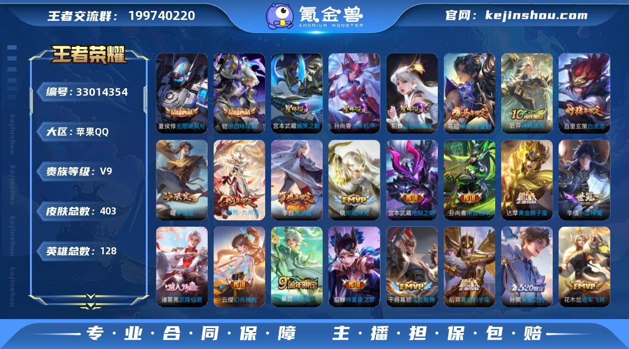 苹果Q-V9-至尊星耀V段位-128英雄-403皮肤-2典藏皮肤-22传说-116史诗 【英雄全皮】:孙权全皮,鬼谷子全皮,狂铁全皮,猪八戒全皮,敖隐全皮,空空儿全皮,影全皮 【荣耀典藏】:夏侯惇无限飓风号,铠银白咏叹调 【传说皮肤】:马超神骥逐星野,后羿神树通天,澜愿照九州拓,云缨幻光神枪,桑启鸣野蒿,孙策挚爱之约,曜李逍遥 ,镜炽阳神光,虞姬启明星使,李信一念神魔,张良黄金白羊座,干将莫邪久胜战神,达摩黄金狮子座,百里玄策白虎志,花木兰冠军飞将,后羿黄金射手座,诸葛亮武陵仙君,貂蝉仲夏夜之梦,李白凤求凰,孙尚香末日机甲,宫本武藏地狱之眼,孙悟空地狱火 【限定皮肤】:白起狰,暃埋骨钱,姜子牙天穹之誓,狄仁杰阴阳师,虞姬凯尔特女王,赵云皇家上将,赵云龙胆,墨子神迹守卫,嬴政优雅恋人,嬴政白昼王子,鲁班七号狮舞东方,庄周高山流水,高渐离玩趣恶龙,钟无艳超时空战士,白起夜都怪侠,芈月重明,芈月幻夜卜梦,吕布猎兽之王,周瑜赤莲之焰,元歌云间偶戏,元歌无心,夏侯惇朔风刀,夏侯惇匿光决锋者,甄姬游园惊梦,甄姬落雪兰心,曹操烛龙,典韦穷奇,典韦蓝屏警告,马可波罗暗影游猎,马可波罗山海玄木吟,狄仁杰魔术师,狄仁杰万华元夜,达摩...
