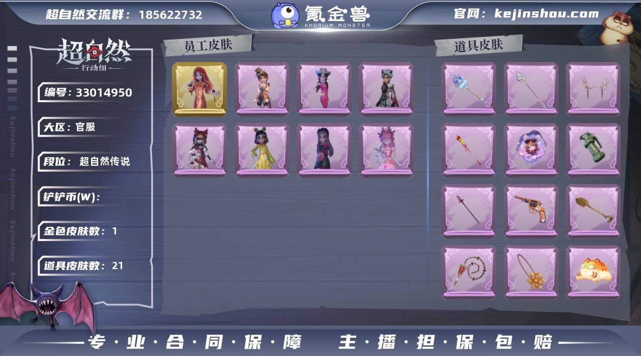 ZR904 金色皮肤数量:1 紫色皮肤数量:7 道具皮肤数量:21 红色皮肤数量:0 粉色皮肤数量:0 外观:镜花辞 丝缕哀歌 呱呱雨衣 耀眼的你 情公主 黎明猎手 莓果陷阱 庆宴绮愿 道具:宝剑八 金戈玄铜 红运福虎 龙鳞 飞花令 鸣沙鼓 糖葫芦霸王枪 青玉抱丹 波塞冬 happy猫 惊魂娃娃 敛花容 缚誓之锁 罪棘 新星时代 权杖的许诺 金丝眼镜 蔷薇物语 露露扇 乘风溯雪 花落精绝 饰品:烛光纪念 雪墩墩头套 马上有钱 惊魂南瓜头套 火爆了头套 烈焰红唇头套 哈士奇头套 驼半仙头套 腊肠扭扭 大葱明头套 萨卡班甲鱼头套 嘻嘻头套 蒜了八 饺饺者头套 呆滞头套 滑稽头套 炙热烧烤 面具马头套 鱼头怪头套 卑微头套 太空鲨头套 樱桃奶油布丁 像素朋克墨镜 后室幸存者头套 钗头凤 晚安小熊 未竟乐园 孤独对望 糖果守卫 小鲨包包 天使消失的年代 牛啤背包 蝶恋花 醉花阴 动作:鹏友摇 心跳摇 新年摇 汽车摇 鸳鸯戏 舞台中心 luvaboy DL摇 鞭子舞 带你逃跑吧 拜年 抬手 要糖 旋转舞 举牌 蝴蝶步 工牌背景:卷珠帘 珊瑚海 童话扉页 佛系小豚 鸢尾花 蓝海奇遇 花蕾城堡 永夜巡礼 永恒之阶 工牌动作:虔诚之姿 鸦影 元气剪刀手 净禅 员工:艾伦 零 薇薇安 巫铃儿 兰 小黄 爱丽丝 逍遥 临云 小满 爱德...