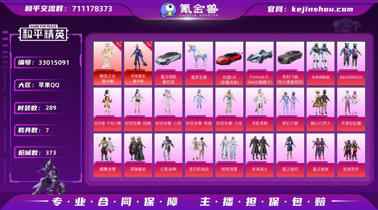 2红装 46粉装 23粉枪 7载具 289套装 373枪皮 宾利飞驰(布罗德盖棕双色) Formula E Gen2(巅峰兰) 仰望U9(赤霞丹朱) 星梦玉骢 星河领航(磐石银) 精灵之光-露米娜 宇宙意志-塞卢姆 梦幻火箭 宝贝奶油派 天使彩虹糖 甜心巧克力 星之彼岸 蝶舞迷情 星之信仰 超能勇士 炫光之旅 军械专家 星梦畅游 玲珑飞花 WiFi精灵 空投萌叽 炫蓝之夏 银松藏云 花园小羊咩 黄色名流 牛气满满 猛禽 云纹魔法士 甜蜜告白 破晓战魂 鹤鸣 冷血极客 天籁歌者 电音精灵 耀粉歌者 极光玫瑰 潮流炫酷 火舞潮人 暗夜魅影 威严将相 莱茵河畔 福星高照 银河圣歌 柠萌假日 王牌教练 微雨春柳 青玉碎影 缤纷假日 浴火魔神 龟仙人 冷焰舞者 贵族骑装 狂战萌兔 香榭午后 霸义无双 萌趣咩咩 竞技名士 娇憨猪猪 深蓝色名流 蓝调潮人 酒红色名流 战地督导 雪鹰学院 灼焰舞者 深海梦境 玉兔迎春 森林游猎者 湖蓝色名流 蓝色守护者 浪漫假日 冰冻风暴 边境牛仔 完美偶像 西部牛仔 街头潮人 怒火燎原 战地英姿 蓝彩潮人 绮丽涂鸦 耀眼新星 特殊使命 旭日情侣 战地领军 缤纷果语 野性战心 Alan Walker 暗金炫舞 幻世战舞者 麻辣教官 人气偶像 神奈川冲浪里 金耀舞者 幻影武者 云霄猎人 都市魅力 摩艾涂鸦 冰川特警 夏日...