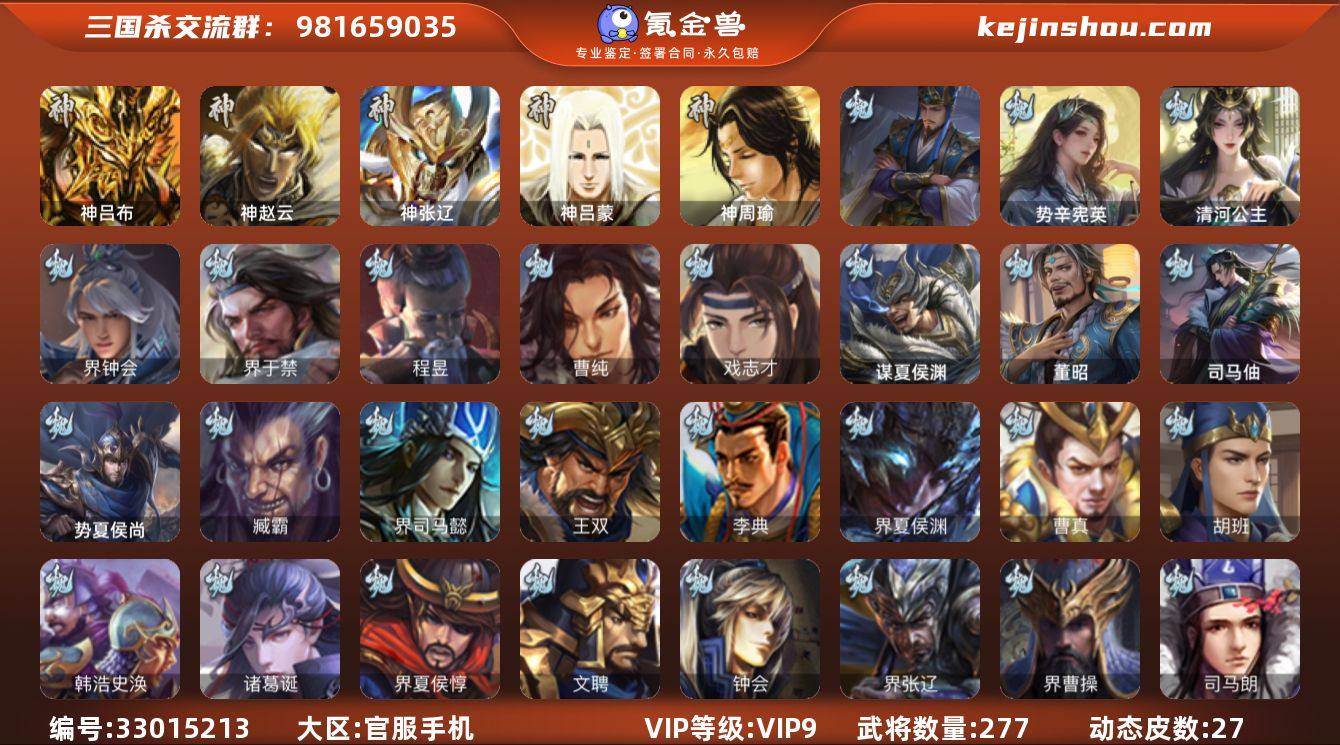 【4828】官阶:骠骑将军;VIP等级:VIP9;史诗武将数量:25;动态皮肤数量:27;武将总数:277;史诗宝珠数量:3;将魂数量:6213;神将:3;魏国史诗武将:4;蜀国史诗武将:3;吴国史诗武将:1;群史诗武将:10