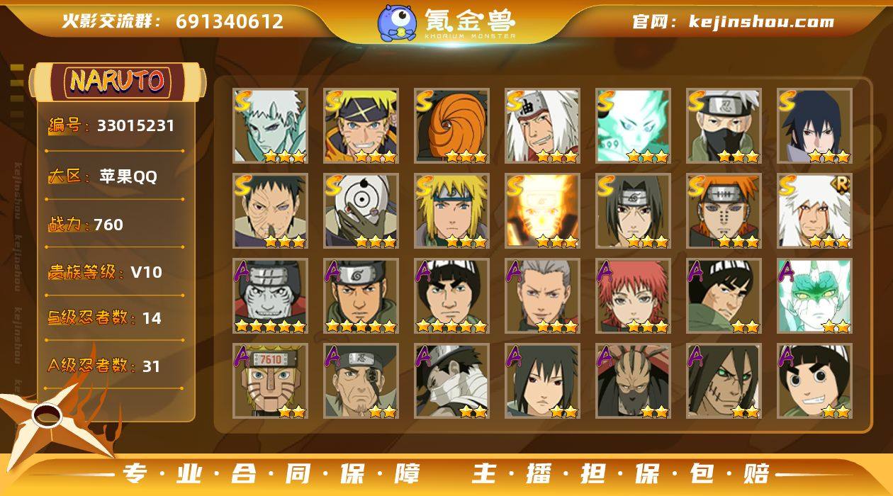 【HYC1766】V10/战力760W/S忍14/A忍31/二星A-波风水门「新春限定」/二星A-我爱罗「疾风传」/三星S-宇智波带土「十尾人柱力」/二星A-飞段「死司凭血」/二星A-宇智波鼬/三星S-宇智波佐助「永恒万花筒」/五星A-猿飞阿斯玛/三星S-旗木卡卡西「须佐能乎」/2星小南「神驹佑将」/三星S-宇智波带土 「忍界大战」/三星A-飞段/三星S-佩恩「天道」/二星A-桃地再不斩「漂泊武士」/三星S-漩涡鸣人·宇智波佐助/三星S-波风水门/三星S-大筒木舍人 「最终章」/三星A-蝎/三星S-漩涡鸣人 「九喇嘛连结」/二星A-秋道丁次「忍界大战」/二星A-角都「秽土转生」/五星A-迈特凯/二星A-李洛克「忍界大战」/二星A-土台「忍界大战」/2星旗木卡卡西「神威对决」/二星A-长十郎「六代目水影」/二星A-波风水门 「青年」/二星A-蝎「绯流琥」/三星S-自来也「舞之豪杰」/二星A-桃地再不斩「秽土转生」/三星S-宇智波斑「白面具」/三星S-自来也 「传说中的三忍」/二星A-宇智波带土「暴怒」/二星A-日向雏田 「最终章」/二星A-宇智波泉奈/二星A-迪达拉/二星A-巳月「仙人模式」/二星A-漩涡鸣人「九尾查克拉」/二星A-迈特凯「青春爆炸」/二星A-宇智波佐助「须佐能乎」/三星S-宇智波斑「五影会谈」/五星A-干柿鬼鲛/二星A-...