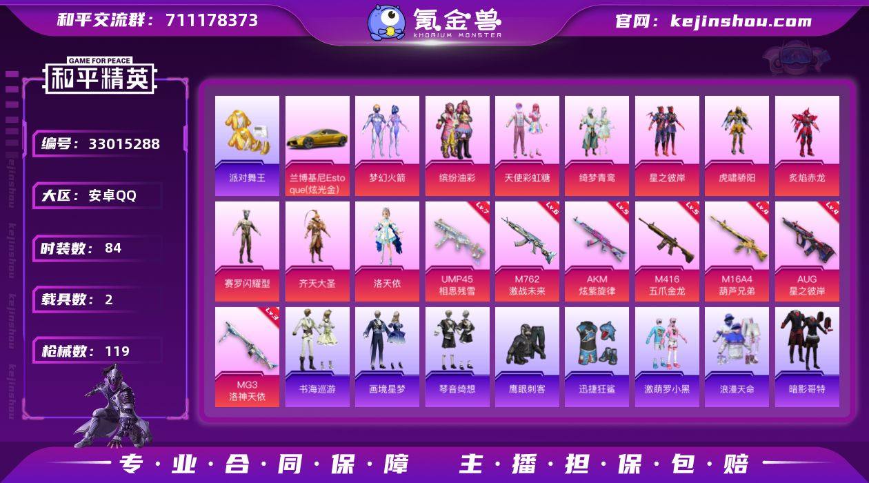 安卓 手Q-11粉装-10特效枪-2载具-4粉色飞行器-48990热力值-5王牌印记-84套装-119枪皮 【热门品类】:粉装-梦幻火箭,粉装-缤纷油彩,套装-浪漫天命,套装-派对舞王,套装-暗影哥特 【粉色套装】:粉装-天使彩虹糖,粉装-梦幻火箭,粉装-缤纷油彩,粉装-绮梦青鸾,粉装-星之彼岸,粉装-虎啸骄阳,粉装-炙焰赤龙,角色-赛罗闪耀型,粉装-齐天大圣,角色-洛天依,角色-罪夜之冕 【粉色枪皮等级】:AKM-炫紫旋律(五级),M16A4-葫芦兄弟(四级),SCAR-L-灵驹仙姬(三级),M416-五爪金龙(五级),AUG-星之彼岸(四级),M762-激战未来(六级),ACE32-萌骑漫游(二级),UMP45-相思残雪(七级),Mk14-福马献瑞(三级),MG3-洛神天依(三级) 【粉色载具】:兰博基尼Estoque(炫光金),凌风神骏 【粉色枪皮】:AKM-炫紫旋律,M16A4-葫芦兄弟,SCAR-L-灵驹仙姬,M416-五爪金龙,AUG-星之彼岸,M762-激战未来,ACE32-萌骑漫游,UMP45-相思残雪,Mk14-福马献瑞,MG3-洛神天依 【粉色飞行器】:香车宝马飞行器,齐天大圣飞行器,踏卷乘风飞行器 【粉色降落伞】:春暖花开降落伞,梦幻火箭降落伞,王牌四分卫降落伞,绮梦青鸾降落伞,星之彼岸降落伞,葫芦兄弟降落伞,齐天大圣降落伞,洛神天依降落伞...