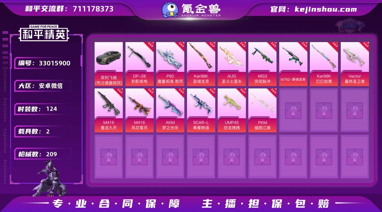 1红装 14粉装 17粉枪 2载具 2稀有装备 124套装 209枪皮 宾利飞驰(布罗德盖棕双色) Mark.06蓝螳螂 M416-墨龙九天(1级) Kar98K-圣域龙灵(3级) Vector-最终圣卫者(3级) M416-风花雪月(1级) AKM-梦之光华(4级) S686-生命誓言 GROZA-影袭 G36C-镜域双华 Mini14-金玉无双 Kar98K-影袭 DBS-焰鹰斗篷 UMP45-恐龙拽拽(4级) SCAR-L-青春物语(4级) DP-28-焰鹰斗篷 MG3-镜域双华 AUG-甜蜜菠萝 M24-影袭 P90-闪光银龙 Mini14-穿刺龙虾 蜜獾-天降萌叽 AC-VAL-快闪甜心 AKM-恐龙拽拽 AMR-乌木金纹 S12K-夜灯 UZI-啾咪啾咪 AKM-影袭 MK20-H-快闪甜心 UMP45-夜灯 SKS-迅猛狂鲨 UZI-影袭 UZI-金玉无双 AWM-焰鹰斗篷 Vector-焰鹰斗篷 P90-快闪甜心 MP5K-乌木金纹 UZI-天降萌叽 UMP45-生命誓言 UZI-幻影战神 M249-沙丘之主 M249-莲影清波 DBS-第五大道 G36C-花间之火 SCAR-L-夜灯 M762-萌物绒绒 P90-乌木金纹 Kar98K-幻影战神 M762-青锋波束(5级) MG3-突变脉冲(4级) AUG-圣斗士星矢(4级) Kar98K-巳巳如意(5级) PKM-江南烟雨(4级) DP-28-豹影疾电(5级) P90-魔童闹海 敖丙 暮色之舞飞行器 灵猫魔法师飞行器 炫彩糖果飞行器 幻海精灵飞行器 沙丘之主天马 镜域双华-灵镜之阶 雀灵庇佑飞行器 灵珠游龙...