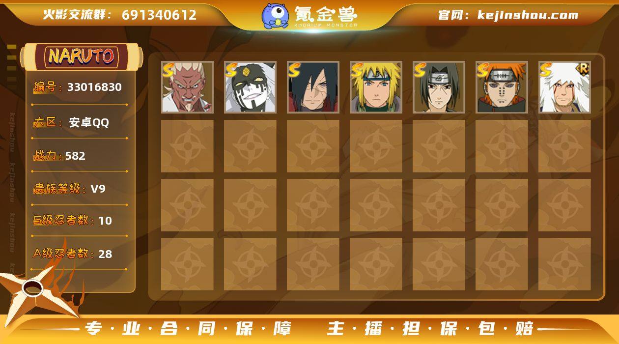 V9 10S忍 28A忍 16通灵 582.3W战力 可二次 可修改实名 【S级忍者】艾「忍界大战」,大筒木桃式,宇智波斑「秽土转生·解」,自来也 「舞之豪杰」,旗木卡卡西「须佐能乎」,自来也 「传说中的三忍」,漩涡鸣人·宇智波佐助,宇智波鼬 「须佐能乎」,佩恩「天道」,波风水门