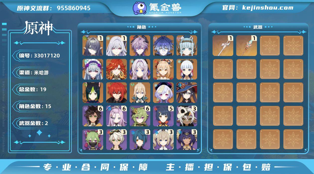 19黄!月感电战舰!魔导队!1命丝柯克!1命菈乌玛!菲林斯!伊涅芙!杜林!火神!茜特菈莉!冒险等级: 57 1命金色角色: 一命丝柯克,一命菈乌玛 0命金色角色: 迪卢克,神里绫华,宵宫,七七,莫娜,琴,提纳里,玛薇卡,茜特菈莉,梦见月瑞希,伊涅芙,菲林斯,杜林 拥有武器: 风鹰剑,天空之脊 1精武器: 风鹰剑,天空之脊