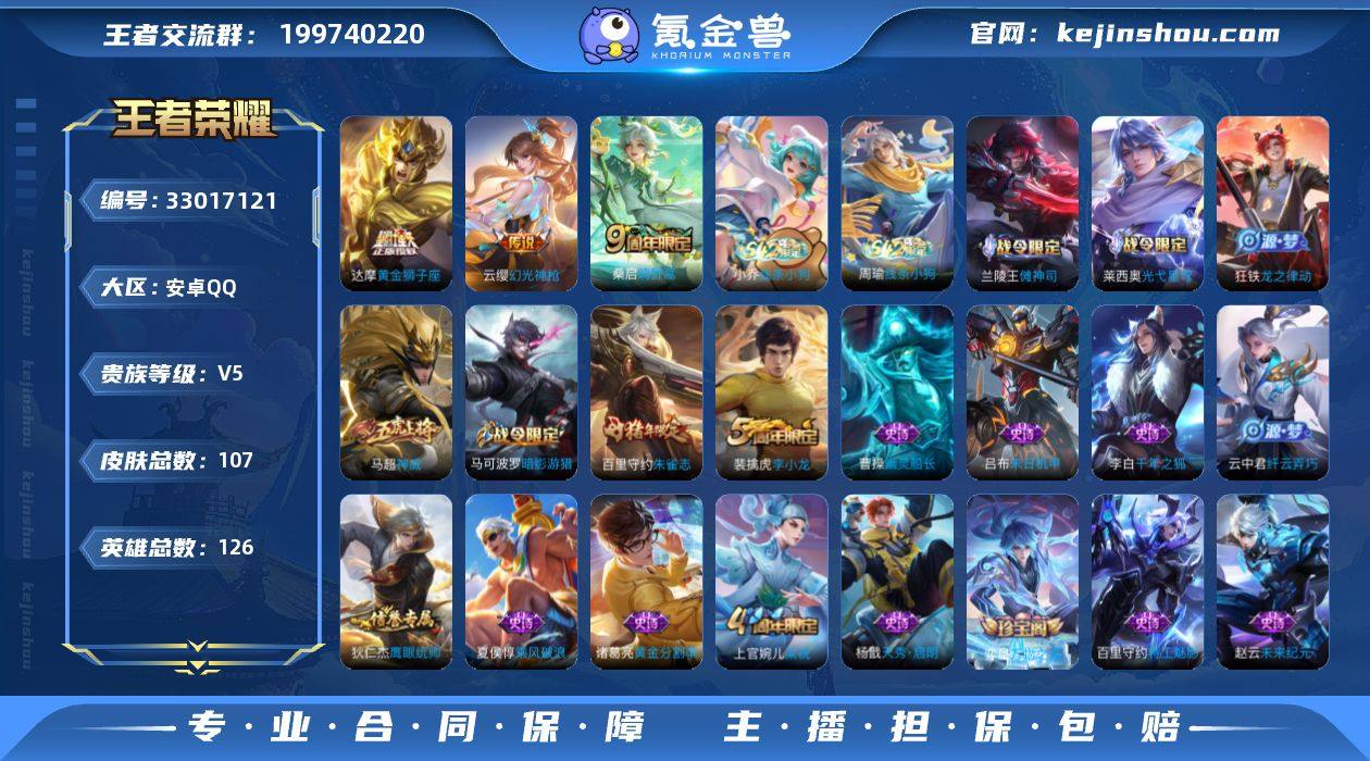 实名: 可修改 性别: 男号 贵族等级: V5 英雄数: 126 皮肤数: 107 传说皮: 黄金狮子座,幻光神枪 限定皮: 李小龙,梁祝,神威,朱雀志,鸣野蒿 亮点: 【优质装备】:黄金狮子座