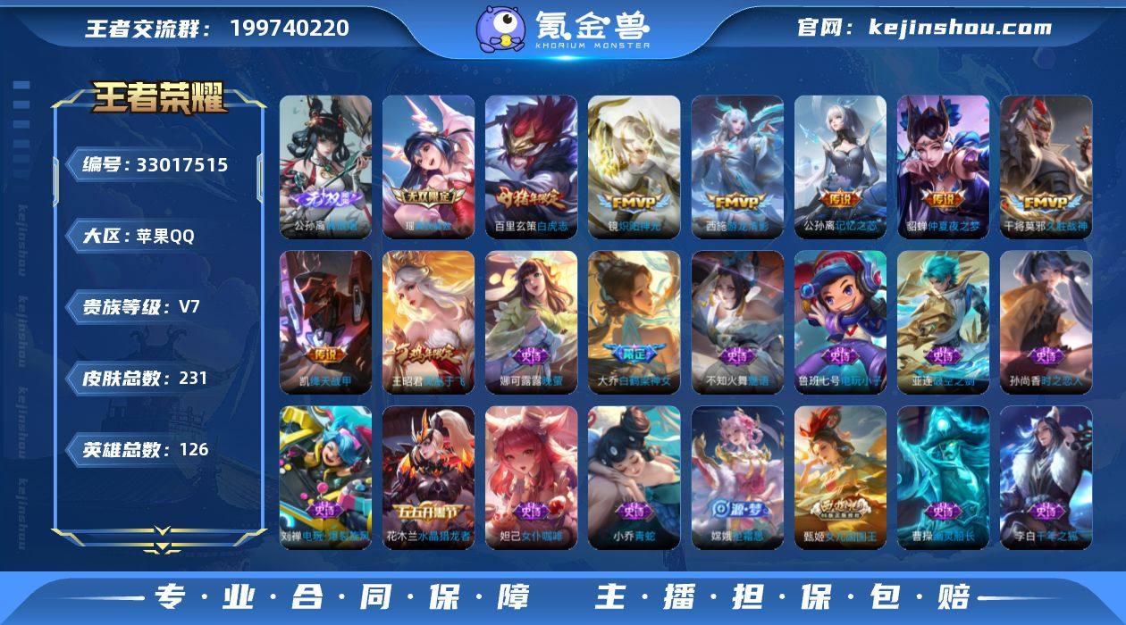 说 126英雄 231皮肤 可修改实名 女号 【英雄全皮】蚩奼全皮,大禹全皮 【稀有英雄】大司命,韩信(韩跳跳),夏洛特(夏师傅),艾琳,橘右京(橘子),娜可露露(鸟人),不知火舞,赵云,金蝉(唐僧),戈娅 【无双皮】离恨烟(公孙离无双),真我赫兹(瑶)(瑶无双) 【传说皮】神骥·聚万邦,神骥·逐星野,神骥·鸣幻洲,游龙清影(小青龙),仲夏夜之梦(大飞蛾),久胜战神,炽阳神光,绛天战甲(鸡嘴战神),记忆之芯(机甲兔) 【珍宝阁皮】万物之道,蔷薇恋人,女武神 【赛季/战令皮】噬灭天穹(s37),古海寻踪(s33),星界游侠,海盐诗旅(s30),擒涛扼浪(s31),探海日志(s32),驭风魔法,玲珑珍味,顽趣-梦奇,剑破天穹(s35),天穹祈灯(s34),青焰无极,苍威无极,天穹之誓(s36),暖冬·兔眠,混沌棋(s18),疑决卦(s19),醍醐杖(s20),原初探秘者(s21),万华元夜(s22),演武夺筹(s23),驱傩正仪(s24),千军破阵(s25),单词大作战,狂想玩偶喵,潮玩骑士王,云间偶戏,沙漠行僧(s26),金庭之子(s27),大漠名商(s28),云中旅人(s29) 【史诗皮】破空之剑,蔬乡物语(鲁班七号),光弋星穹,春霖将至,线条小狗-周瑜,线条小狗-小乔,涂山容容,遇见神鹿,紫霞仙子,电玩小子(小书包),特工魅影,千年之狐,江河有灵,高渐离燃音魔法,蒙恬荣光圣徽,魅语,冰冠公主,青蛇,...