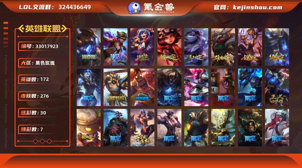 热门皮肤价格亲民 未定级段位-172英雄-276皮肤-30炫彩-0终极-4神话-42限定-25传说-55史诗 【神话皮肤】:十周年纪念安妮,十五周年纪念希维尔,神凰行者瑞羽圣凰艾尼维亚 【海克斯皮肤】:海克斯科技阿木木 【臻彩皮肤】:无畏骑士瑟庄妮赤子初心,冠军之刃锐雯2016凯旋圣装,玉剑传说无影竞星,破败军团厄运小姐灵岛征伐使,海之歌艾希冰爽浪花,魔女阿卡丽虚荣,净雪之月莫甘娜冬虹 【年限皮肤】:你看见过我的熊猫吗安妮,广寒仙子嫦娥,司马懿仲达,烈焰美人薇恩,王国机神玄武盖伦,点心宝贝阿木木 【冰雪限定】:圣诞糖果棒厄运小姐,圣诞狂欢基兰,平安夜女神娑娜,冬季仙境卡尔玛,喜庆之树茂凯,雪默丁格,雪装奈德丽,圣诞玩偶波比,魄罗骑士瑟庄妮,寒冬精灵璐璐 【限定皮肤】:战熊骑士瑟庄妮,冠军之矛卡莉丝塔,Fnatic迦娜,Fnatic嘉文四世,SSW辛吉德,SKTT1伊莉丝,SKTT1烬,SKTT1辛德拉,SSG洛,iG卡莎,FPX锤石,DWG蕾欧娜,暗裔英雄盖伦,胜利机器人布里茨,胜利之运崔斯特,南瓜头费德提克,无头骑士赫卡里姆,机械迷城加里奥,蒙多蒙多,野兽猎人泰达米尔,勇者阿狸,电玩战魂赫卡里姆,玉剑传说舞龙卫,御星魔矢艾希,防暴士兵辛吉德,防暴天使凯尔 【...