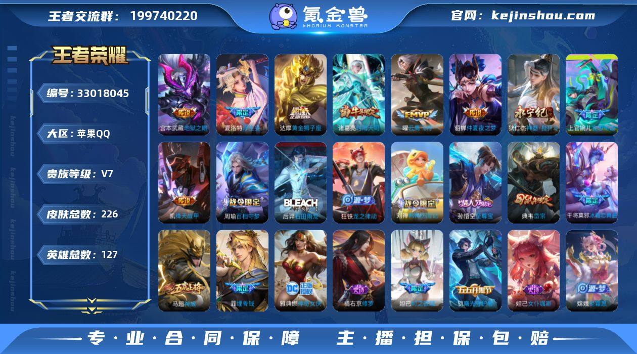 说 127英雄 226皮肤 可修改实名 男号 【英雄全皮】孙权全皮,蚩奼全皮,大禹全皮 【稀有英雄】敖隐(小龙人),大司命,韩信(韩跳跳),夏洛特(夏师傅),艾琳,橘右京(橘子),娜可露露(鸟人),不知火舞,赵云,金蝉(唐僧),戈娅 【荣耀水晶】九霄神辉(木兰典藏) 【传说皮】神骥·逐星野,黄金狮子座,仲夏夜之梦(大飞蛾),地狱之眼,云鹰飞将(小将军),绛天战甲(鸡嘴战神),末日机甲-孙策,神器·狴犴令,浮生妄,妄想奇谈,鹤归松栖(云缨) 【珍宝阁皮】蔷薇恋人,玩趣恶龙 【赛季/战令皮】古海寻踪(s33),海盐诗旅(s30),探海日志(s32),顽趣-梦奇,天穹之誓(s36),御霄(s14),御銮(s16),朔风刀(s17),混沌棋(s18),疑决卦(s19),醍醐杖(s20),原初探秘者(s21),万华元夜(s22),演武夺筹(s23),驱傩正仪(s24),千军破阵(s25),星空之诺,银河之约,沙漠行僧(s26),金庭之子(s27),大漠名商(s28),云中旅人(s29),超时空战士-钟无艳,落雪兰心 【史诗皮】百晓客,茶境仙,埋骨钱,鸭鸭历险记-刘禅,光弋星穹,线条小狗-周瑜,线条小狗-小乔,罗小黑战记-百里玄策,龙之律动,百相守梦-周瑜,石田雨龙,苍穹之光,特工魅影,江河有灵,偶像歌手,猫狗日记-大乔,节奏热浪,修罗,女仆咖啡,水果甜心,星夜王子,心灵骇客,德古拉伯爵,暗隐猎兽者,幽灵船...