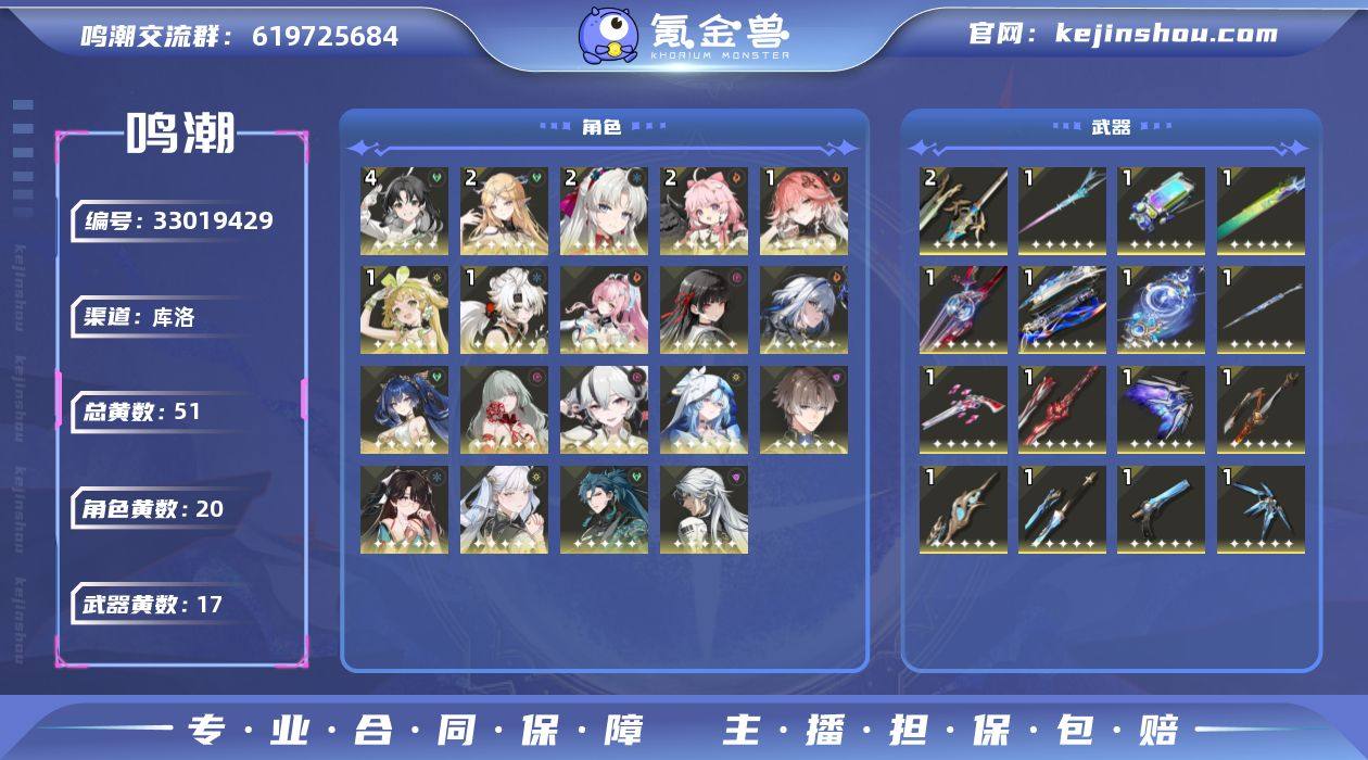 男/女主: 女主 总黄数: 51 联觉等级: 80 拥有五星共鸣者: 忌炎,鉴心,卡卡罗,安可,维里奈,凌阳,今汐,长离,折枝,相里要,守岸人,椿,珂莱塔,卡提希娅,弗洛洛,尤诺,嘉贝莉娜,千咲,爱弥斯 4鸣五星共鸣者: 4鸣鉴心 2鸣五星共鸣者: 2鸣安可,2鸣珂莱塔,2鸣卡提希娅 1鸣五星共鸣者: 1鸣维里奈,1鸣凌阳,1鸣长离 0鸣五星共鸣者: 0鸣忌炎,0鸣卡卡罗,0鸣今汐,0鸣折枝,0鸣相里要,0鸣守岸人,0鸣椿,0鸣弗洛洛,0鸣尤诺,0鸣嘉贝莉娜,0鸣千咲,0鸣爱弥斯 拥有五星武器: 千古洑流,停驻之烟,漪澜浮录,时和岁稔,赫奕流明,星序协响,裁春,死与舞,血誓盟约,不屈命定之冠,万物持存的注释,光影双生,昙切,镭射切变,脉冲协臂,永远的启明星 2鸣五星武器: 2鸣血誓盟约 1鸣五星武器: 1鸣千古洑流,1鸣停驻之烟,1鸣漪澜浮录,1鸣时和岁稔,1鸣赫奕流明,1鸣星序协响,1鸣裁春,1鸣死与舞,1鸣不屈命定之冠,1鸣万物持存的注释,1鸣光影双生,1鸣昙切,1鸣脉冲协臂,1鸣镭射切变,1鸣永远的启明星 亮点: 【MC182】80级/51黄/女主/20个五星角色/17个五星武器未绑定,西格莉卡,爱弥斯,千咲,嘉贝莉娜,尤诺,弗洛洛,卡提希娅,珂莱塔,椿,守岸人,相里要,折枝,长离,今汐,忌炎,维里奈,鉴心,卡卡罗,安可,凌阳,永远的启明星,镭射切变,脉冲协...