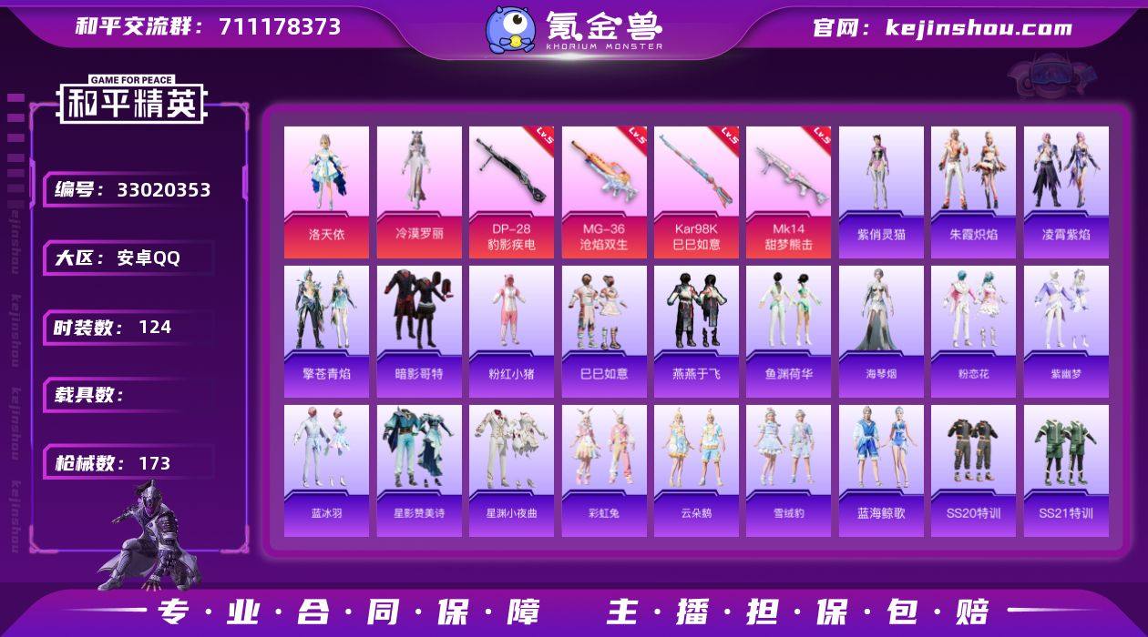 不可二次 安卓 手Q-2粉装-7特效枪-0载具-1粉色飞行器-45646热力值-9王牌印记-124套装-173枪皮 QW264216 【热门品类】:套装-暗影哥特,套装-粉红小猪 【粉色套装】:角色-洛天依,角色-冷漠罗丽 【粉色枪皮等级】:UMP45-萌骑冒险(二级),AKS-74U-森灵之息(五级),Kar98K-巳巳如意(五级),Mk14-甜梦熊击(五级),Mk14-福马献瑞(五级),DP-28-豹影疾电(五级),MG-36-沧焰双生(五级) 【粉色枪皮】:UMP45-萌骑冒险,AKS-74U-森灵之息,Kar98K-巳巳如意,Mk14-甜梦熊击,Mk14-福马献瑞,DP-28-豹影疾电,MG-36-沧焰双生 【粉色飞行器】:炫彩糖果飞行器 【粉色降落伞】:洛神天依降落伞,鬼刀降落伞,雪月幻音降落伞,星穹咏叹调降落伞,幻彩电音降落伞,绯穹魔姬降落伞,异瞳寒姬降落伞,炫彩糖果降落伞,辉云木星降落伞,鸢尾珑雾降落伞 【稀有套装】:套装-巳巳如意,套装-雪国风尚,套装-炫彩糖果,套装-马上有钱,套装-迅捷龙虾,套装-燕燕于飞,套装-鱼渊荷华,角色-海琴烟,套装-粉恋花,套装-紫幽梦,套装-蓝冰羽,套装-星影赞美诗,套装-星渊小夜曲,套装-彩虹兔,套装-云朵鹅,套装-雪绒豹,套装-蓝海鲸歌,套装-朱霞炽焰,套装-凌霄紫焰,套装-擎苍青焰,角色-紫俏灵猫...