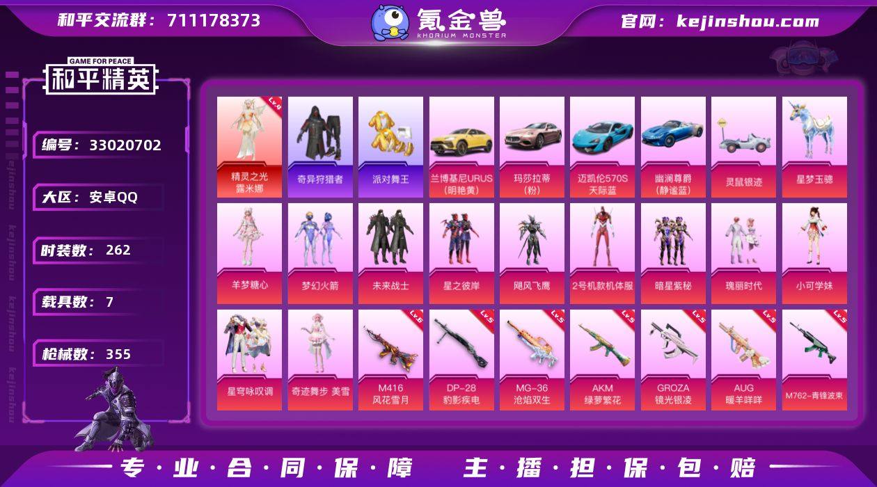 安卓【极品神装号/15王牌印记/精灵之光-露米娜(四级)/灵驹仙姬-云歌(一级)/梦幻火箭/2号机款机体服/派对舞王/暗影哥特/蓝螳螂/兰博基尼URUS(明艳黄)/玛莎拉蒂Ghibli(粉)/百万伏特背包/萌熊伴侣背包/2神装-11粉装-21特效枪-7载具-12粉色飞行器】 手Q--129582热力值-15王牌印记-262套装-355枪皮 【红色神装等级】:灵驹仙姬-云歌(一级),精灵之光-露米娜(四级) 【红色角色神装】:灵驹仙姬-云歌,精灵之光-露米娜 【热门品类】:粉装-梦幻火箭,套装-浪漫天命,套装-派对舞王,套装-奇异狩猎者,套装-金羽特工,套装-SS1特训,套装-龟仙人,套装-暗影哥特,套装-粉红小猪,角色-Mark.06 【粉色套装】:粉装-未来战士,粉装-梦幻火箭,粉装-星之彼岸,粉装-飓风飞鹰,角色-2号机款机体服,粉装-暗星紫秘,粉装-瑰丽时代,角色-小可学妹,粉装-星穹咏叹调,角色-奇迹舞步 美雪,角色-羊梦糖心 【粉色枪皮等级】:AKM-绿萝繁花(五级),SCAR-L-灵驹仙姬(三级),M416-风花雪月(六级),M416-天马神君(三级),GROZA-精灵之光(三级),GROZA-镜光银凌(五级),AUG-星之彼岸(三级),AUG-暖羊咩咩(五级),M762-青锋波束(五级),ACE32-萌骑漫游(五级),汤姆逊-热量炸弹(五级),AKS-74U-森...