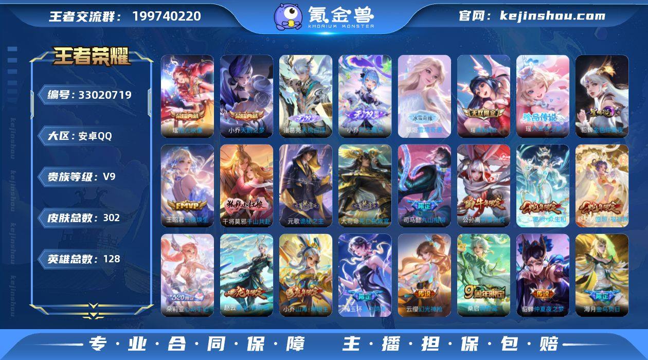 贵族9/皮肤302/典藏2/传说26/史诗94/英雄128/元歌全皮/孙权全皮/朵莉亚全皮/大司命全皮/海诺全皮/少司缘全皮/天鹅之梦/拾光映像/李信问心剑/天机白泽/雪境奇遇-甄姬/小乔时之魔女/真我赫兹(瑶)/金色仲夏夜/伽罗沧流箭/大耳狗之梦/云缨神骥越千峰/关羽神骥镇沧海/朵莉亚神骥鸣幻洲/狄仁杰神骥赴朔漠/貂蝉神骥聚万邦/马超神骥逐星野/长夜焕生/千山共赴/诡秘之主/死亡执政官/九山相柳/星之鸣奏/愿照·众生和/愿照·福禄聚/幻光神枪/鸣野蒿/朵莉亚心动手记/金乌负日/乘龙·铭钟鼎/妄想实况/灼幽烈阳/无限倾心-虞姬/山海·琳琅生/祈雪灵祝/启明星使/仲夏夜之梦/财神纳福/力鸭全场/铃舟系梦/墨染江湖/埋骨钱/蒙犽顽岩魄/蔡文姬夏日便利店/大乔绒语心约/虞姬夏日便利店/天穹之誓(s36)/破阵·退雄兵/阴阳师/皇家上将/热情桑巴/时之彼端/高山流水/玩趣恶龙/天狼运算者/云间偶戏/无心/朔风刀(s17)/魔术师/万华元夜(s22)/海滩派对/醍醐杖(s20)/演武夺筹(s23)/奔雷神使/辉光之辰/云中旅人(s29)/驱傩正仪(s24)/原初探秘者(s21)/五谷丰年/白鹤梁神女/千军破阵(s25)/原初追遂者/混沌棋(s18)/疑决卦(s19)/李小龙/擒涛扼浪(s31)/山海·碧波行/纤云弄巧/御銮(s16)/梁祝/拒霜思/玲珑珍味/狂想玩偶喵/探...