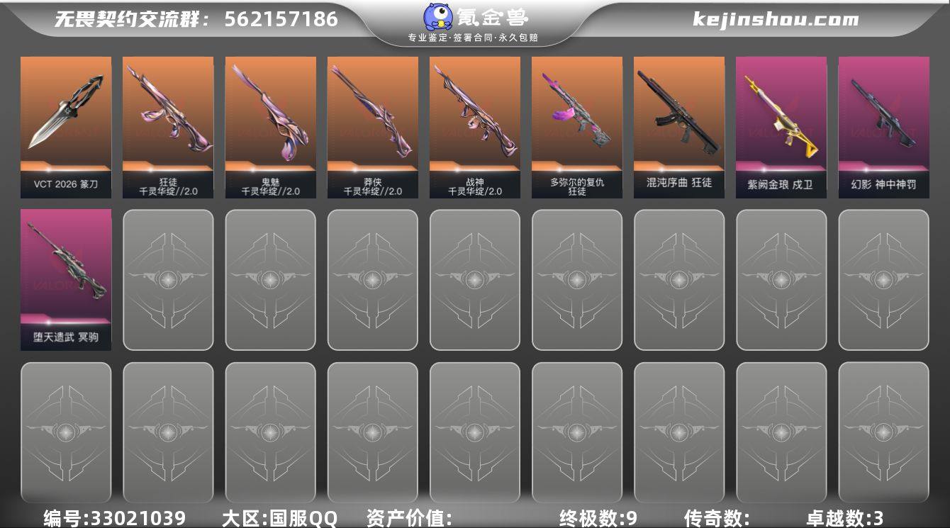 【套装】:VCT 2026 赛季套装,千灵华绽//2.0套装【英雄】:炼狱,暮蝶,钛狐,壹决,铁臂,捷风,不死鸟,贤者,猎枭,零,芮娜,尚勃勒,霓虹,海神,盖可,黑梦【近战武器】:近战武器-VCT 2026 篆刀,近战武器-流风回雪【狂徒】:狂徒-混沌序曲,狂徒-多弥尔的复仇,狂徒-千灵华绽//2.0【幻影】:幻影-神中神罚【戍卫】:戍卫-紫阙金琅【冥驹】:冥驹-堕天遗武【莽侠】:莽侠-千灵华绽//2.0【战神】:战神-千灵华绽//2.0【骇灵】:骇灵-无限竞技【鬼魅】:鬼魅-千灵华绽//2.0【卡面】:Clutch 卡面,梦幻奶茶 卡面,代号红色 卡面,新兵报到 卡面,V契约 卡面,无畏契约 卡面【喷漆】:捷风差距 喷漆,胜利属于无畏契约 喷漆,GLHF 喷漆,无畏契约 喷漆【挂饰】:无畏契约 纪念币 挂饰