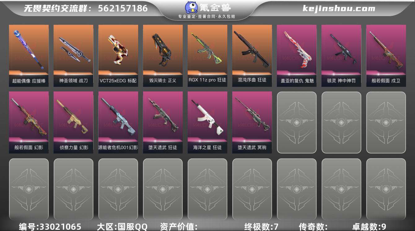 【英雄】:幻棱,炼狱,维斯,暮蝶,钛狐,壹决,铁臂,捷风,雷兹,幽影,不死鸟,贤者,猎枭,蝰蛇,零,芮娜,奇乐,尚勃勒,霓虹,斯凯,夜露,星礈,K/O,海神,盖可,黑梦,钢锁【近战武器】:近战武器-穿花蝴蝶,近战武器-超能偶像 应援棒,近战武器-神圣领域 战刀【狂徒】:狂徒-混沌序曲,狂徒-RGX 11z Pro,狂徒-堕天遗武,狂徒-海洋之星,狂徒-超能偶像【幻影】:幻影-般若假面,幻影-源能者危机001,幻影-侦察力量,幻影-超限闪存,幻影-神圣领域,幻影-聚合之力【戍卫】:戍卫-般若假面,戍卫-超能偶像,戍卫-浮光跃金,戍卫-月球哨兵【獠犬】:獠犬-神圣领域,獠犬-采蜜小蜂队,獠犬-模拟赫兹【冥驹】:冥驹-堕天遗武,冥驹-模拟赫兹,冥驹-星云暗涌【飞将】:飞将-聚合之力【莽侠】:莽侠-超限闪存,莽侠-月球哨兵【战神】:战神-神圣领域,战神-采蜜小蜂队,战神-浮光跃金【判官】:判官-超能偶像,判官-采蜜小蜂队【雄鹿】:雄鹿-模拟赫兹,雄鹿-月球哨兵【骇灵】:骇灵-神中神罚,骇灵-浮光跃金,骇灵-星云暗涌【蜂刺】:蜂刺-超限闪存,蜂刺-聚合之力,蜂刺-星云暗涌【标配】:标配-超能偶像,标配-浮光跃金【VCT手枪】:标配-VCT25 x EDG【正义】:正义-...