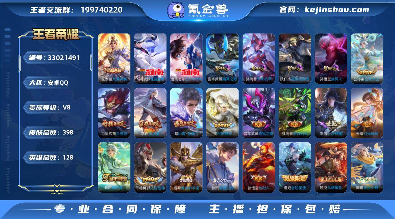 安卓Q-V8-最强王者段位-128英雄-398皮肤-1典藏皮肤-2珍品传说-15传说-109史诗【英雄全皮】:扁鹊全皮,刘邦全皮,孙权全皮,鬼谷子全皮,狂铁全皮,敖隐全皮,戈娅全皮,空空儿全皮,影全皮【荣耀典藏】:花木兰九霄神辉【珍品传说】:鲁班七号江户川柯南,马可波罗怪盗基德【传说皮肤】:公孙离云诺千山,云缨幻光神枪,桑启鸣野蒿,曜山海苍雷引,孙策挚爱之约,镜炽阳神光,虞姬启明星使,李信一念神魔,干将莫邪久胜战神,百里玄策白虎志,后羿黄金射手座,李白凤求凰,孙尚香末日机甲,宫本武藏地狱之眼,孙悟空地狱火【限定皮肤】:白起狰,姜子牙天穹之誓,狄仁杰阴阳师,虞姬凯尔特女王,赵云皇家上将,墨子神迹守卫,嬴政优雅恋人,嬴政白昼王子,孙尚香蔷薇恋人,鲁班七号狮舞东方,庄周高山流水,高渐离玩趣恶龙,阿轲迷踪丽影,扁鹊炼金王,扁鹊奇幻香踪,白起夜都怪侠,芈月重明,芈月幻夜卜梦,吕布猎兽之王,周瑜赤莲之焰,元歌云间偶戏,夏侯惇朔风刀,甄姬游园惊梦,曹操烛龙,典韦穷奇,马可波罗暗影游猎,马可波罗山海玄木吟,狄仁杰魔术师,狄仁杰万华元夜,达摩沙漠行僧,项羽海滩派对,老夫子醍醐杖,老夫子航海奇遇记,程咬金演武夺筹,露娜一生所爱,...