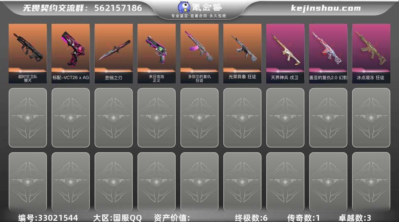 【Hww746】国服Q区 皮肤价值15800 【橙皮6金皮1紫皮3皮肤27英雄14卡面37已用源晶300】 铂金 优质皮肤:悲悯之刃,狂徒-光荣异象 【套装】:无畏契约季前邀请赛套装 【英雄】:幻棱,炼狱,暮蝶,捷风,雷兹,不死鸟,贤者,猎枭,蝰蛇,芮娜,霓虹,斯凯,盖可,黑梦 【近战武器】:近战武器-无畏契约季前邀请赛 悲悯之刃 【狂徒】:狂徒-光荣异象,狂徒-多弥尔的复仇,狂徒-冰点凝冻 【幻影】:幻影-盖亚的复仇//2.0 【戍卫】:戍卫-天界神兵 【獠犬】:獠犬-超时空卫队 【VCT手枪】:标配-VCT26 x AG 【正义】:正义-末日泡泡 【卡面】:《双城之战》金克丝 卡面,代号红色 卡面,新兵报到 卡面,V契约 卡面,无畏契约 卡面 【喷漆】:霓光四射 喷漆,关门放狗 喷漆,红鳞 喷漆,松叶 喷漆,放下武器 喷漆,胜利属于无畏契约 喷漆,GLHF 喷漆,无畏契约 喷漆 【挂饰】:无畏契约GO!第一卷 零 挂饰,无畏契约 纪念币 挂饰