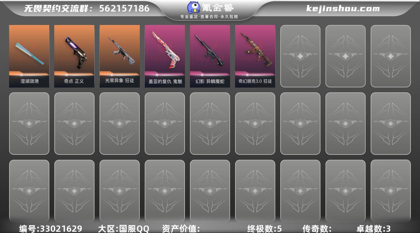 【英雄】:炼狱,捷风,不死鸟,贤者,猎枭,芮娜【近战武器】:近战武器-澄湖潋滟,近战武器-生物分子解离器【狂徒】:狂徒-光荣异象,狂徒-奇幻朋克//3.0【幻影】:幻影-异鳞魔蛇【正义】:正义-奇点【鬼魅】:鬼魅-盖亚的复仇【卡面】:无畏契约GO!第一卷:芮娜 卡面,无畏契约GO!第一卷:零 卡面,《双城之战》金克丝 卡面,纪念照 P2 卡面,沙尘幻旅 卡面,代号红色 卡面,新兵报到 卡面,V契约 卡面,无畏契约 卡面【喷漆】:霓光四射 喷漆,买装还是存钱 喷漆,关门放狗 喷漆,无畏契约GO!第一卷:贤者 喷漆,胜利属于无畏契约 喷漆,GLHF 喷漆,无畏契约 喷漆【挂饰】:无畏契约GO!第一卷 零 挂饰,鱼骨头 挂饰,天外飞客 挂饰,《双城之战》魄罗 挂饰,无畏契约 纪念币 挂饰