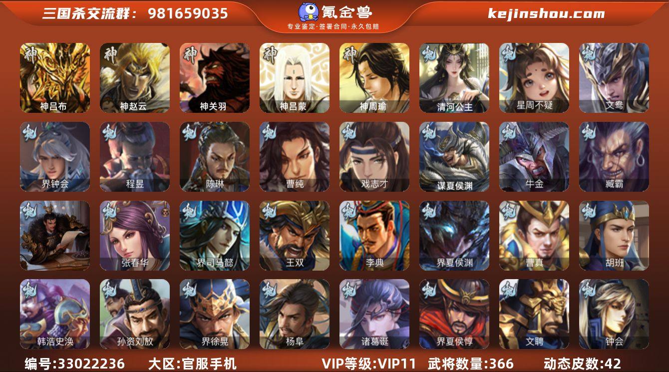 【4831】官阶:大将军;VIP等级:VIP11;史诗武将数量:38;动态皮肤数量:42;武将总数:366;史诗宝珠数量:3;将魂数量:10652;神将:2;魏国史诗武将:23;蜀国史诗武将:7;吴国史诗武将:12;群史诗武将:12