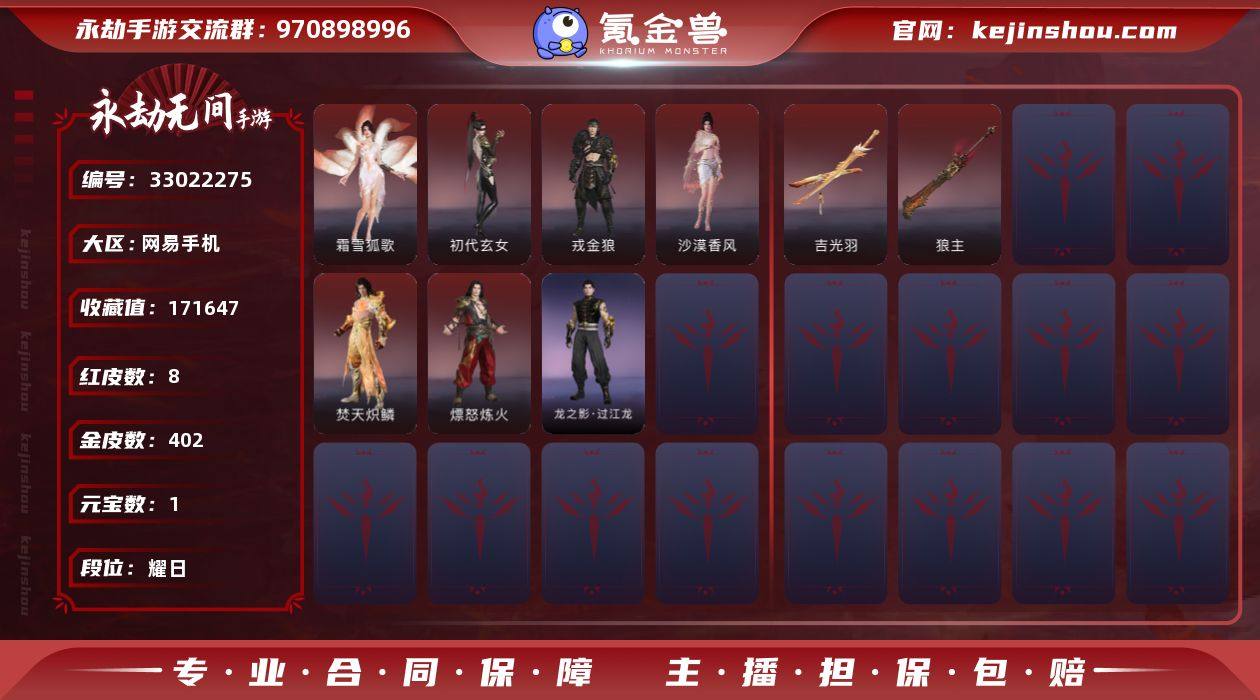 WJ5802,网易手机手游,可换绑,四人段位曜日2,8红,402金,金人俑,御祥云,金焰狐舞,神君印,吉光羽,狼主,沙漠香风,焚天炽鳞,熛怒炼火,初代玄女,戎金狼,霜雪狐歌,过江龙,天渊御水,警长制服,福寿仙,纤羽翎风,腓腓,班长制服,