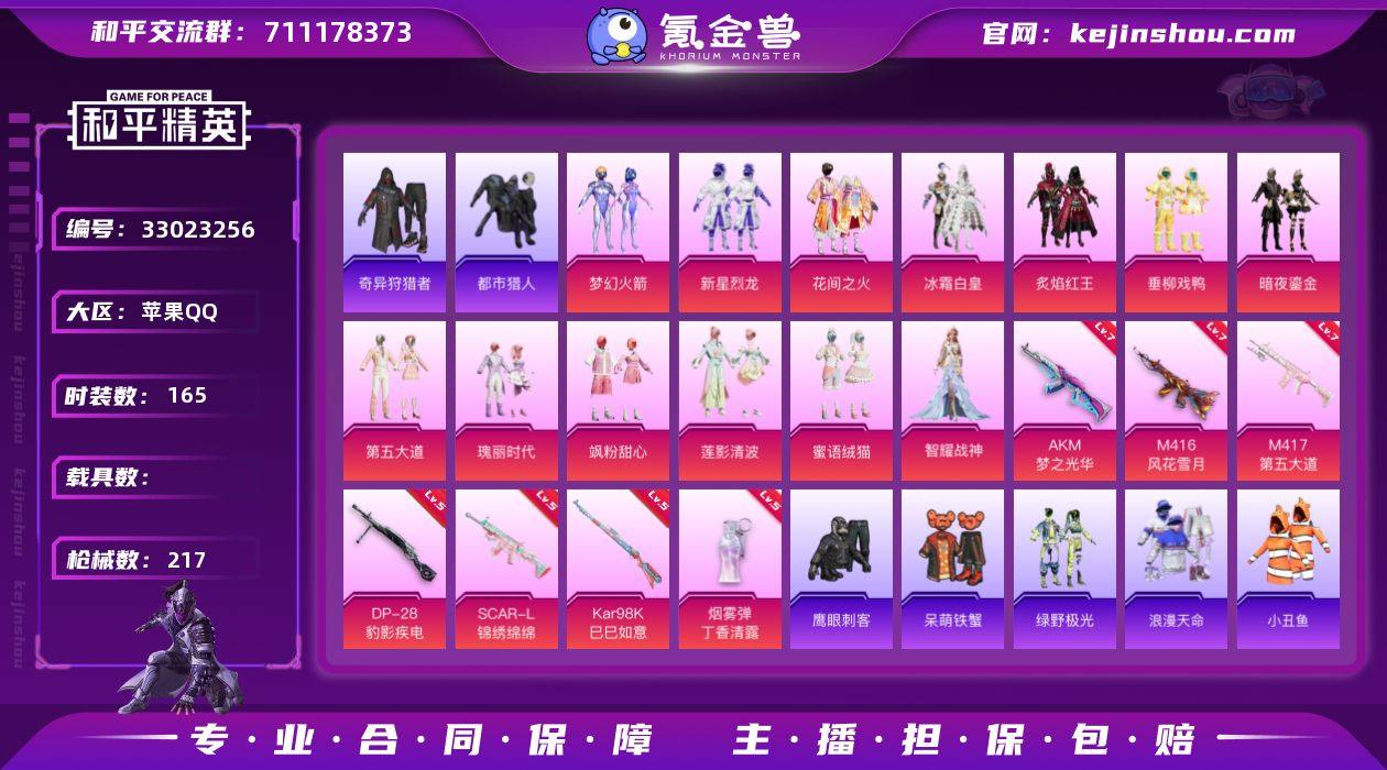 苹果 手Q-13粉装-8特效枪-0载具-6粉色飞行器-75530热力值-17王牌印记-165套装-217枪皮 【热门品类】:粉装-梦幻火箭,套装-浪漫天命,套装-都市猎人,套装-小丑鱼,套装-奇异狩猎者,角色-军刀雅典娜,套装-龟仙人,套装-暗影哥特,角色-8号机,大砍刀-青龙偃月刀 【粉色套装】:粉装-梦幻火箭,粉装-新星烈龙,粉装-花间之火,粉装-冰霜白皇,粉装-炙焰红王,粉装-垂柳戏鸭,粉装-暗夜鎏金,粉装-第五大道,粉装-瑰丽时代,粉装-飒粉甜心,粉装-莲影清波,粉装-蜜语绒猫,角色-智耀战神 【粉色枪皮等级】:AKM-梦之光华(七级),SCAR-L-锦绣绵绵(五级),M416-风花雪月(七级),AKS-74U-森灵之息(五级),Kar98K-巳巳如意(五级),M417-第五大道(七级),DP-28-豹影疾电(五级),烟雾弹-丁香清露(五级) 【粉色枪皮】:AKM-梦之光华,SCAR-L-锦绣绵绵,M416-风花雪月,AKS-74U-森灵之息,Kar98K-巳巳如意,M417-第五大道,DP-28-豹影疾电,烟雾弹-丁香清露 【粉色飞行器】:炫彩糖果飞行器,春暖花开飞行器,梦幻火箭飞行器,古战神甲飞行器,深渊漩涡飞行器 【粉色降落伞】:春暖花开降落伞,梦幻火箭降落伞,童趣迷兔降落伞,环太平洋降落伞,垂柳戏鸭降落伞,彩虹甜喵降落伞,青空...