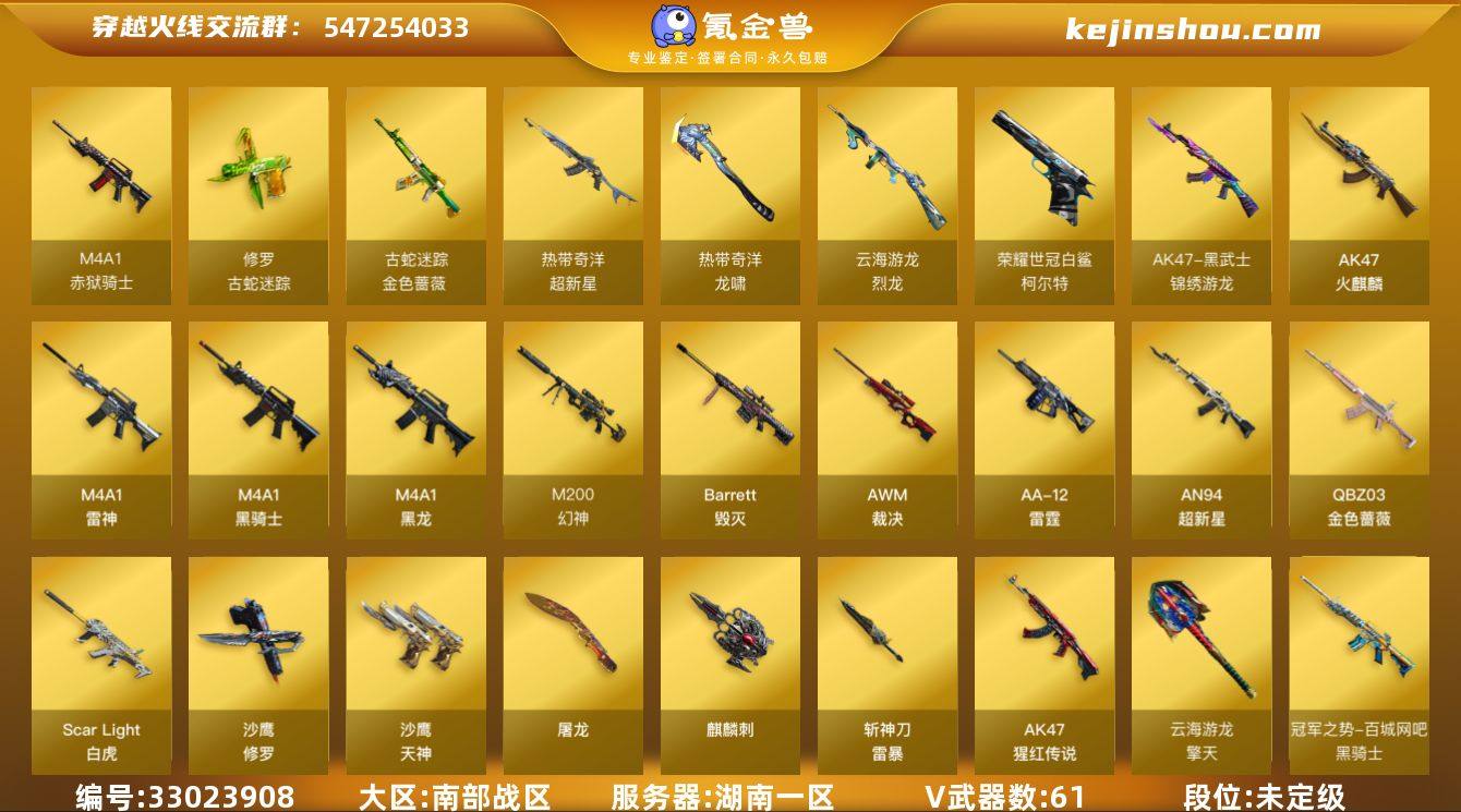 湖南一区-62V-5王者武器数-0炫金武器数 【传说角色】:传说影煞 【热门武器】:QBZ03-金色蔷薇,M14EBR-玄武,Scar Light-白虎,M200-幻神,柯尔特-荣耀世冠白鲨2023,金色蔷薇-古蛇迷踪,修罗-古蛇迷踪,M4A1-黑骑士,毁灭-孙三炮*2,COP-白鲨,沙鹰-修罗 【音效卡】:炼狱-百战金芒-庆典舞曲音效卡 【皮肤】:幻神-宠儿-2021MVP,M200-幻神-N9-2022MVP,QBZ03-巅峰荣耀皮肤,裁决-流光秘银,星神-破竹皮肤,雷神-R.LGD-CFPLS18冠军,雷神-CFS十周年纪念版 皮肤,M4A1-再燃火线,火麒麟-百城,毁灭-SV-CFPLS16冠军,毁灭-百城浙江 皮肤,黑龙-墨子皮肤,黑骑士-冠军之势,黑骑士-AG-S4冠军典藏,屠龙-荣耀之锋,屠龙-QQ会员,屠龙-春桃 皮肤,龙啸-纸灯龙皮肤,轻型军用手斧-再燃火线,麒麟刺-萌杀皮肤,麒麟刺-荣耀世冠白鲨 【角色】:审判者,王者影豹,蛇隐宗,奇洋探员,云海玲珑,暗夜-X,嘉年华灵狐,0号玩家,灵动武士,灵狐者-X,龙儿-小淘气,麻雀,曼陀罗-X,潘多拉-X,蛇姬,斯沃特-X,铁骑荣耀 【人偶武器】:COP-白鲨,毁灭-孙三炮*2,AWM-灵狐-15周年嘉年华 【英雄级武器】:AK47-火麒麟,M4A1-黑龙,M4A1-雷神,M4A1-黑骑士,AN94-超新星,Scar Light-白虎,M...