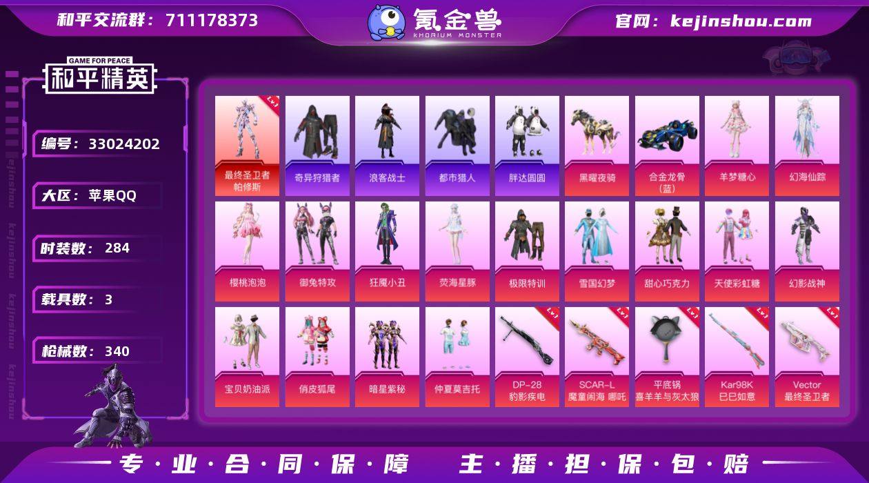 可二次实名【双字ID 2级红装都市猎人浪客战士红眼罩雪国幻梦16粉装13特效枪3载具小熊背包胖达圆圆素材号 秒换绑不用等】 苹果Q区-123442热力值-284套装-340枪皮 【1红装】 最终圣卫者-帕修斯(2级)【3载具】 阿斯顿·马丁DBS(绿) 合金龙骨(蓝) 黑曜夜骑【9稀有】 都市猎人 萌熊伴侣背包(小熊背包) 攀登者外套/裤子 恶魔人蛛 胖达圆圆卤蛋头 冷酷挑战者 奇异狩猎者 浪客战士 红眼罩【16粉装】 狂魇小丑(新小丑) 极限特训 雪国幻梦(冰雪女王) 宝贝奶油派 天使彩虹糖 甜心巧克力 暗星紫秘 仲夏莫吉托 幻影战神 俏皮狐尾 角色-樱桃泡泡 御兔特攻 角色-幻海仙踪 角色-荧海星豚 角色-羊梦糖心【13特效枪】 M416-灵猫魔法师(3级) Vector-最终圣卫者(3级) M416-心之恋语(6级) Kar98K-伏魔团(5级) Mk14-闲梦青缨(6级) SCAR-L-锦绣绵绵(5级) AWM-花间之火(7级) AKM-绿萝繁花(5级) 蜜獾-荧海星豚(4级) Kar98K-巳巳如意(5级) DP-28-豹影疾电(5级) SCAR-L-魔童闹海 哪吒(3级) 平底锅-喜羊羊与灰太狼(4级)【320热门】 RSG追光队服 胖达圆圆 暗夜契约(假黑丝) 暗影哥特(红眼罩) 浪漫天命 都市猎人(蓝口罩) 雪山精英(老6服) 好奇恐龙 小丑鱼 迅捷狂鲨 大橘为重 金羽特工 团圆交子 瑞龙...