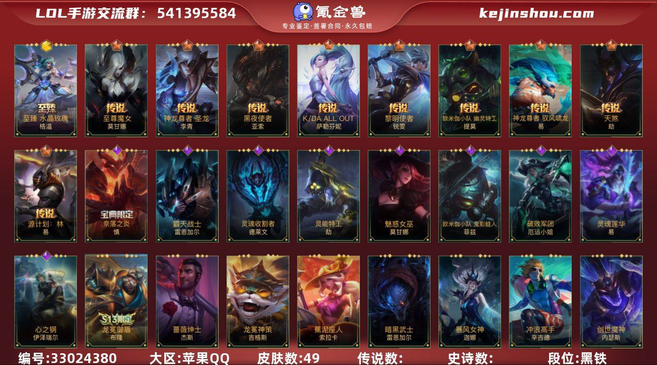 【LOLSYH433】53英雄/49皮肤/2神话/华贵铂金/至臻水晶格温/至臻 斗魂无双 艾瑞莉娅/北极星神 黛安娜/至尊魔女 莫甘娜/K/DA ALLOUT萨勒芬妮/黑夜使者亚索/天煞劫/欧米伽小队 幽灵特工/神龙尊者 圣龙 李青/源计划:林/神龙尊者 驭风啸龙/黎明使者锐雯/霸天战士狮子狗/魅惑女巫莫甘娜/灵能特工劫/破败军团女枪/灵魂莲华剑圣/灵魂收割者/欧米伽小队 鬼影蛙人/心之钢伊泽瑞尔/奈落之炎 慎/鳄霸 雷克顿/s6绯金丽刃/s7绯金战斧/s13龙冕御盾/s14龙冕神策/s15龙冕异士/s16冠翎飞行员/s17冠翎御风使/S18冠翎巨神像/S19冠翎征服者/死亡骑士/暗黑武士狮子狗/光明骑士卡尔玛/三昧真火/双城之战金克丝/龙冕御盾布隆/龙冕异士戏命师/冠翎征服者 尼菈/钢铁意志/银色之牙/绯金丽刃(可升级)/擂台皇帝/西部牛仔亚索/女警官/冠翎飞行员 库奇/制胜金球/创世魔神/暴风女神/冠翎御风使 迦娜/绯金战斧(可升级)/兔宝宝炸弹人/龙冕神策吉格斯/冲浪高手/蕉泥座人/冠翎巨神像 加里奥/蔷薇绅士杰斯/鳄霸/腥红之月锤石