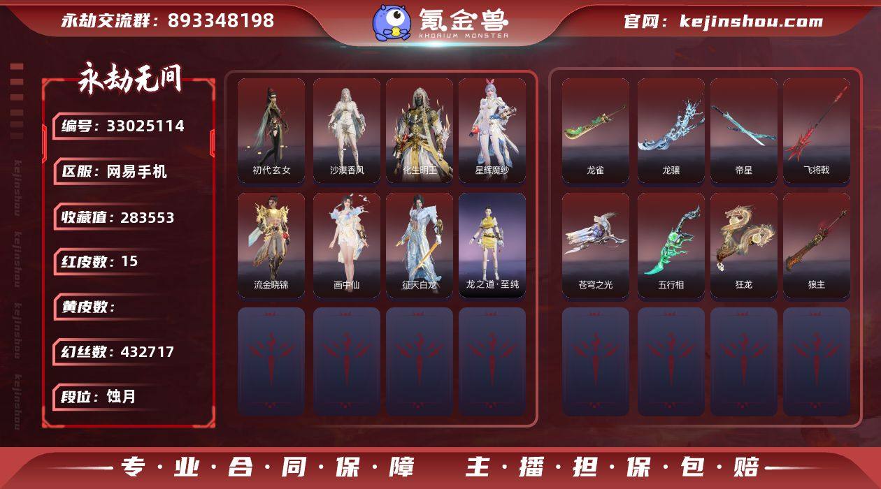 WJ5815,网易手机,可换绑,三人段位蚀月3,15红,425金,43万幻丝,声望9,DVa小兔徽章,四海,帝星,龙雀,狼主,飞将戟,五行相,狂龙,龙骧,苍穹之光,初代玄女,星辉魔纱,化生明王,沙漠香风,流金晓锦,画中仙,征天白龙,至纯,斩春,醉花风,霜素,断暗,千钧羽,宝月琉璃,糖衣甜心,蝴蝶心,云朵咩咩,蜘蛛精,云溪仙子,鹅黄纱梦,李星云,暗夜利刃,汐泪,金戈止,赤焰舞影,幽夜玲珑,钟鼎光,云间影,活动中心手机绑定无法解绑,
