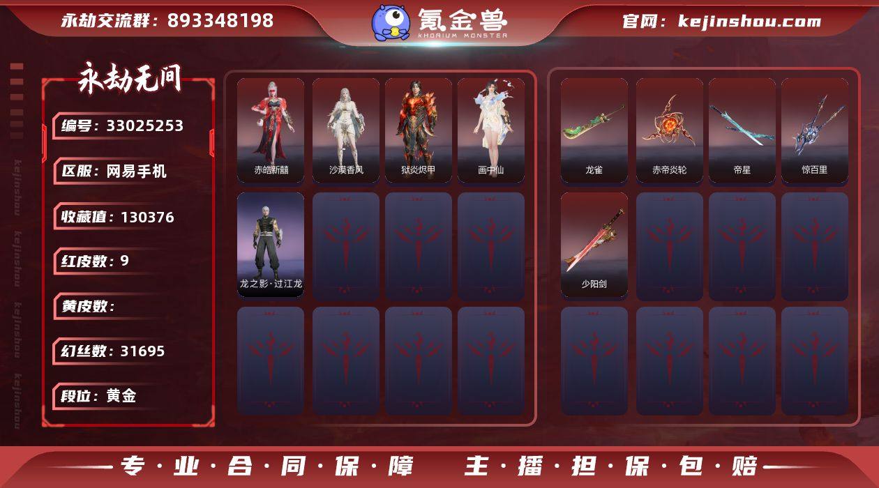 WJ5818,网易手机,可换绑,三人段位黄金5,声望1,9红,103金,等级174,收藏值130376,幻丝31695,金砖44,通行证Lv1,变身器,千秋匠心凶虎,红色神品,沙漠香风,画中仙,赤皓新囍,狱炎烬甲,赤帝炎轮,龙雀,少阳剑,惊百里,帝,角色金色皮肤,寒烟素,浣烟纱,瀚海苍鹰,街头狂欢不败擂主,斑斓衣,街头狂欢涂鸦少女,观山海腓腓,春不敛,梨园传奇丽娘,赤诚心,观山海春神句芒,护世四法多闻天王,昆仑之主,九阴圣女,妖刀姬,楚韵九歌湘夫人,赤雾烟霞,常胜袍,龙之影过江龙,发型金色皮肤,P5RNOIR发型发,(挑染)白芷发,逆水寒江海发,木棉发,(挑染)羽客发,(挑染)冰羽发,惊雀发,(挑染)玄冥发,武器金色皮肤,沉默审判,戏祥云,钻山,竹霹雳,龙啸,丹鹤,心魔,月虹弦角,乌木弓,炎魔,诡刃八岐,塑梦钥匙,青石猊,听涛,灵木角,焦钰,长虹,建木,委蛇矛,倒马棍,2674贰型电浆杖,华夏神兵马首刀,青峰叠扇,耀夜流华,镇魔杵,精武,古墓丽影登山镐,蛋仔派对咸鱼,无救,祸忌,破重云,壶中日月,含光承影,切影,饰品金色皮肤,玄陶俑面男,目瞪马呆男,玄陶俑面女,目瞪马呆女,安乐冠,盗墓笔记防风帽,染红纱,活动中心手机绑定无法解绑,