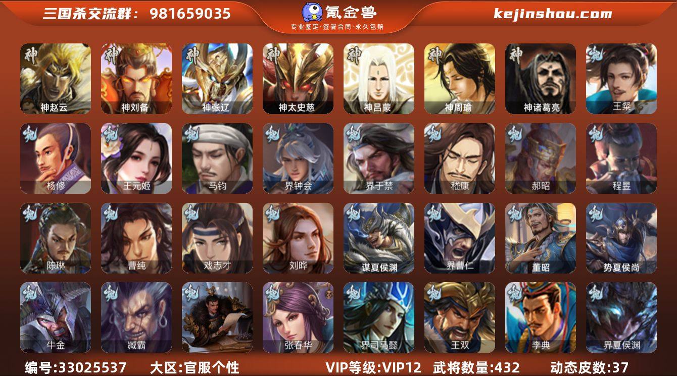 【14789957】官阶:大将军;VIP等级:VIP12;史诗武将数量:57;动态皮肤数量:37;武将总数:432;史诗宝珠数量:8;将魂数量:2461;神将:5;魏国史诗武将:23;蜀国史诗武将:13;吴国史诗武将:10;群史诗武将:17