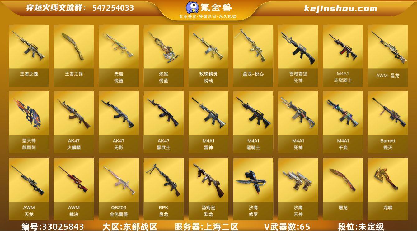 上海二区-73V-12王者武器数-0炫金武器数 【热门武器】:QBZ03-金色蔷薇,死亡之眼,M4A1-黑骑士,汤姆逊-烈龙*6,RPK-盘龙*6,沙鹰-修罗*5 【王者炫金武器】:天启-悦智,玫瑰精灵-悦动*2,王者之魄,盘龙-悦心*3,炼狱-悦蓝*2,王者之锋 【音效卡】:AK47-火麒麟音效卡,M4A1-黑骑士音效卡,Barrett-毁灭音效卡,Barrett-碧霄极光音效卡,炼狱-百战金芒-庆典舞曲音效卡,死神-雪域霜狐-怀旧音效卡 【皮肤】:金色蔷薇-电竞之星 皮肤,AWM-裁决-凤灵皮肤,雷神-暗月,雷神-虎将,M4A1-再燃火线,雷神-神秘按键 皮肤,毁灭-暗月*5,毁灭-星空,毁灭-英雄计划 皮肤,M4A1-千变-孔明皮肤,黑龙-能量核心,黑骑士-暗月*2,黑骑士耀金皮肤,无影-暗月*6,无影-能量核心,死神-秘银,天启-暗月*3,战神-紫绶金章皮肤*3,战神-流金岁月皮肤*2,天龙-秘银*2,天龙-能量核心,修罗-能量核心*3,修罗-百战金芒 皮肤,天神-暗月*2,龙啸-醒狮 皮肤,轻型军用手斧-再燃火线 【角色】:零,葵,樱,战地猎狐,王者-魅影,雪域霜狐,修道士,云海玲珑,暗夜-X,芳心审判者,风暴女,零-水下丽影,龙儿,铁骑荣耀,影武者-X 【人偶武器】:迷你深渊冰龙*2,迷你牛牛,迷你生化手雷,生化手雷-...