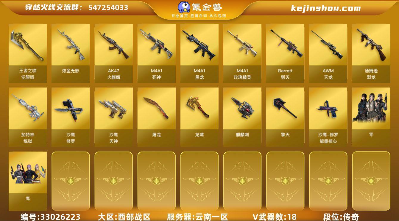 【ky5796】云南一区-27V-7王者武器数-1炫金武器数 【热门武器】:死亡之眼*2,汤姆逊-烈龙,加特林-炼狱,沙鹰-修罗 【王者炫金武器】:炫金无影 【皮肤】:毁灭-英雄计划 皮肤,修罗-能量核心,屠龙-巅峰荣耀 皮肤 【角色】:零,鹰,修道士,云海玲珑,潘多拉-X,潘多拉-甜心教官,铁骑荣耀 【人偶武器】:生化手雷-机甲核心 【暴走生化】:死亡之眼*2 【英雄级武器】:AK47-火麒麟,M4A1-黑龙,M4A1-死神,M4A1-玫瑰精灵,AWM-天龙,Barrett-毁灭,Barrett-金色蔷薇,加特林-炼狱,汤姆逊-烈龙,沙鹰-修罗,沙鹰-天神,屠龙,龙啸,擎天*2,麒麟刺,王者之啸-觉醒版 【道具】:CFS限定背包,战舰背包,炫彩背包,绿色巨人,灵魂忍者,迷雾幽灵,夺命之镰,防化服*2,金色流光-枪王排位,防弹头盔*2,防弹衣*2,C4工具钳*2,手雷包*2 【特殊枪械】:1烈龙,1炼狱