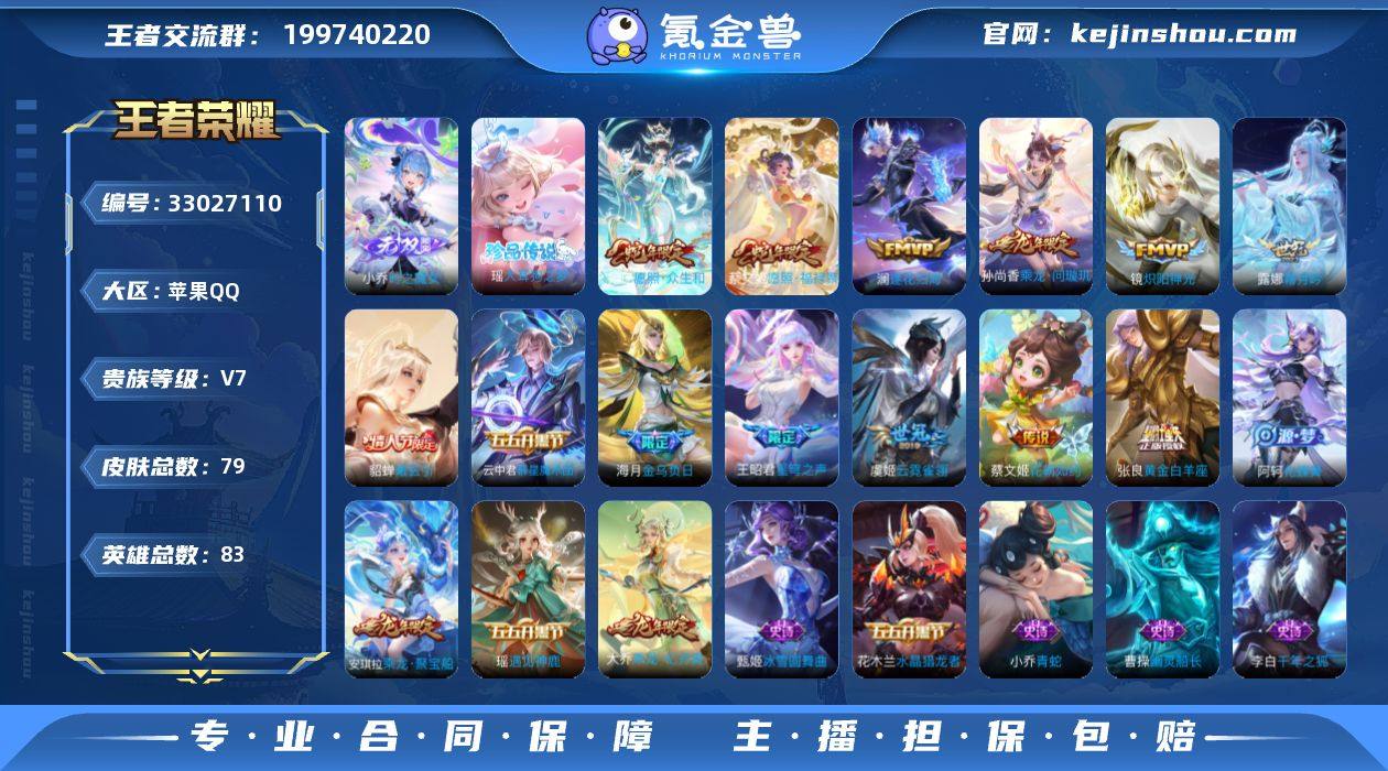 实名: 可修改 性别: 女号 贵族等级: V7 英雄数: 83 皮肤数: 79 无双皮: 小乔时之魔女 珍品传说: 大耳狗之梦 传说皮: 黄金白羊座,炽阳神光,云霓雀翎,花朝如约,霜月吟,澜逐花归海,乘龙·问璇玑,貂蝉曦玄引,金乌负日,云中君群星魔术团 限定皮: 星穹之声,愿照·众生和,愿照·福禄聚 亮点: 【优质装备】:小乔时之魔女(小乔无双),大耳狗之梦,黄金白羊座,炽阳神光,云霓雀翎,花朝如约(花篮子),霜月吟,澜逐花归海,金乌负日,云中君群星魔术团