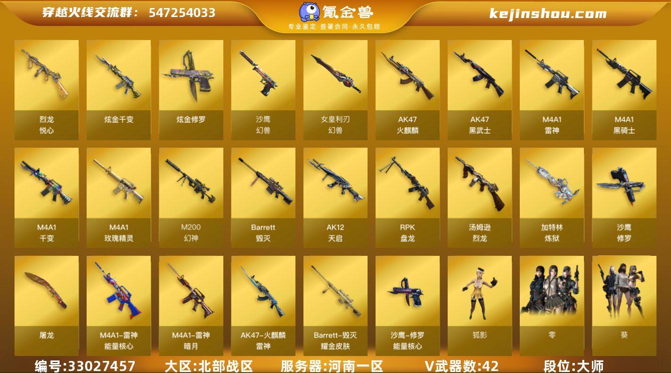 【ky5999】河南一区-50V-1王者武器数-2炫金武器数 【热门武器】:M200-幻神,死亡之眼,M4A1-黑骑士*2,汤姆逊-烈龙*6,RPK-盘龙*4,加特林-炼狱,沙鹰-修罗*2,高爆手雷-幻兽*2 【王者炫金武器】:烈龙-悦心,炫金千变,炫金修罗 【音效卡】:Barrett-毁灭音效卡 【皮肤】:幻神-冠军之幻,雷神-暗月,雷神-能量核心,火麒麟-雷神,毁灭耀金皮肤,毁灭-英雄计划 皮肤,修罗-能量核心 【角色】:零,葵,樱,狐影,乔伊教练,云海玲珑,风暴女,娟娟,零-水下丽影,潘多拉-甜心教官,影武者-X 【人偶武器】:天龙-曼陀罗,火麒麟-灵狐,M4A1-斯沃特 【暴走生化】:死亡之眼 【英雄级武器】:M4A1-千变,AK47-火麒麟,M4A1-雷神*2,M4A1-黑骑士*2,AK47-黑武士*2,AK12-天启,M4A1-玫瑰精灵,HK417-朱雀-电竞之星,Barrett-毁灭,M200-幻神,Barrett-金色蔷薇,RPK-盘龙*4,加特林-炼狱,汤姆逊-烈龙*6,沙鹰-修罗*2,沙鹰-幻兽*2,屠龙*2,女皇利刃-幻兽,高爆手雷-幻兽*2,闪光弹-幻兽*2,闪光弹-幻灵,烟雾弹-幻兽*2,烟雾弹-幻灵,烟雾弹-云龙 【道具】:战舰背包,绿色巨人,灵魂忍者,变异宝贝,迷雾幽灵,夺命之镰,防化服*2,金色流光-枪王排位,防弹头盔*2,防弹衣*2...