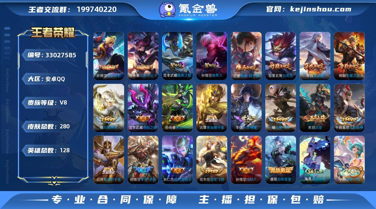 王者20428,不可二次,绝版梅西,282夺宝,扣扣钱包无法注销,安卓Q-V8-至尊星耀IV段位-128英雄-280皮肤-2典藏皮肤-18传说-78史诗 【英雄全皮】:猪八戒全皮 【荣耀典藏】:孙悟空全息碎影,孙尚香杀手不太冷 【传说皮肤】:云缨神骥越千峰,镜炽阳神光,虞姬启明星使,孙悟空零号赤焰,关羽武圣,曜云鹰飞将,李信一念神魔,干将莫邪久胜战神,达摩黄金狮子座,百里玄策白虎志,花木兰冠军飞将,后羿黄金射手座,杨戬永曜之星,李白凤求凰,孙尚香末日机甲,宫本武藏地狱之眼,孙悟空地狱火,狄仁杰超时空战士 【限定皮肤】:白起狰,狄仁杰阴阳师,赵云皇家上将,赵云引擎之心,赵云龙胆,嬴政优雅恋人,嬴政白昼王子,鲁班七号狮舞东方,阿轲迷踪丽影,吕布猎兽之王,周瑜赤莲之焰,元歌云间偶戏,夏侯惇朔风刀,典韦穷奇,典韦蓝屏警告,马可波罗暗影游猎,狄仁杰魔术师,狄仁杰万华元夜,达摩星际陆战队,达摩沙漠行僧,项羽海滩派对,老夫子醍醐杖,关羽冰锋战神,关羽武圣,程咬金演武夺筹,露娜一生所爱,刘邦夺宝奇兵,韩信飞衡,王昭君凤凰于飞,兰陵王驯魔猎人,兰陵王金庭之子,花木兰瑞麟志,花木兰默契交锋,亚瑟潮玩骑士王,孙悟空至尊宝,孙悟空大圣娶亲,孙...