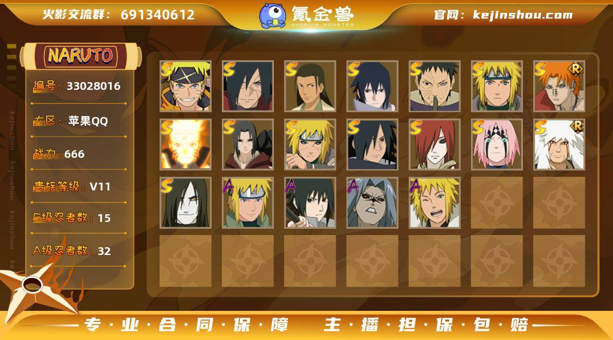 HY22041|【可实名】可二次 666w战力 v11 苹果QQ 2358区 S忍者数:15 A忍者数:32 时装14苹果QQ 2358区 S忍者数:15 A忍者数:32 忍者:漩涡鸣人·宇智波佐助,宇智波斑「秽土转生·解」,千手柱间「木叶创立」,宇智波佐助「永恒万花筒」,春野樱「忍界大战」,漩涡鸣人「九喇嘛连结」,宇智波斑「木叶创立」,宇智波带土「忍界大战」,宇智波鼬「秽土转生」,自来也「舞之豪杰」,佩恩·天道「超」,波风水门「秽土转生」,长门「秽土转生」,波风水门,大蛇丸,小南「神驹佑将」,迈特凯「青春爆炸」,宇智波佐助「侠隐江湖」,宇智波泉奈,日向宁次「忍界大战」,长十郎「六代目水影」,长门「青年」,艾「青年」,达鲁伊「五代目雷影」,波风水门「青年」,奇拉比「忍界大战」,宇智波佐助「须佐能乎」,照美冥「夏日泳装」,漩涡鸣人「九尾查克拉」,千代「近松十人卫」,宇智波佐助「疾风传咒印」,我爱罗「忍界大战」,秋道丁次「忍界大战」,春野樱「百豪」,波风水门「新春限定」,照美冥「五代目水影」,宇智波佐助「万花筒写轮眼」,漩涡鸣人「仙人模式」,飞段「死司凭血」,飞段,迪达拉,我爱罗「疾风传」,蝎,干柿鬼鲛,宇智波鼬,猿飞阿斯玛,迈特凯,二位由木人「奇拉比落风传」,夕日红「冬日限定」,奈良鹿丸「最终...
