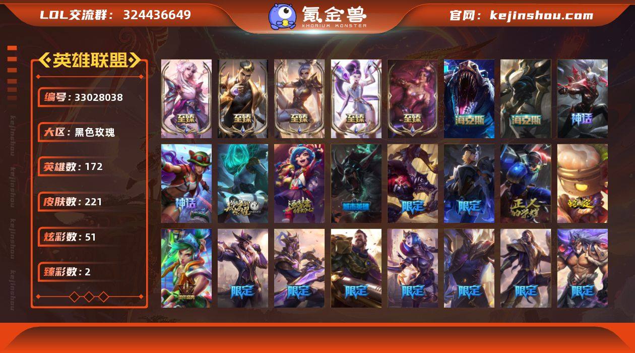 未定级段位-172英雄-221皮肤-51炫彩-0终极-12神话-28限定-25传说-53史诗 【神话皮肤】:十周年纪念安妮,源代码乐芙兰,十五周年纪念希维尔,殿堂传奇薇恩 【至臻皮肤】:至臻剪纸仙灵希维尔,至臻玉剑传说武剑仙锐雯,至臻灵魂莲华拉克丝,至臻T1杰斯,至臻KDAALLOUT卡莎,至臻灵魂莲华劫 【海克斯皮肤】:海克斯科技雷克顿,零之枪骑赫卡里姆 【臻彩皮肤】:雾雨之刃锐雯 【年限皮肤】:点心宝贝阿木木 【冰雪限定】:圣诞开心鬼提莫,圣诞精灵崔丝塔娜,胡桃夹子萨科,圣诞玩偶波比,圣诞老人古拉加斯 【限定皮肤】:舞会公主安妮,冠军之血希瓦娜,暗杀星努努和威朗普,SSW图奇,SKTT1瑞兹,电玩勇者锐雯,暗裔英雄盖伦,胜利枪神格雷福斯,胜利女神奥莉安娜,胜利之剑亚托克斯,胜利枪神卢锡安,胜利之王泰达米尔,胜利巨口克格莫,胜利剑圣易,胜利之运崔斯特,胜利女神菲奥娜,南瓜头费德提克,鬼影重重魔腾,无头骑士赫卡里姆,暗影沃里克,都铎王朝图奇,防暴天使凯尔 【传说皮肤】:地狱之门卫士加里奥,魔幻卡牌崔斯特,战场女武神凯尔,约德尔国队长提莫,烈焰雄心崔丝塔娜,女皇艾希,绅士科加斯,双重冰晶艾尼维亚,黯晶凤凰艾尼维亚,电玩女神娑娜,陆地王者4W...