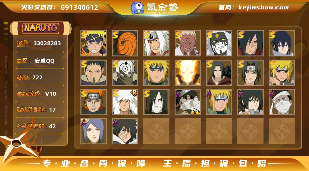HY22036|【可实名】可二次 722w战力 v10 安卓QQ 2500区 S忍者数:17 A忍者数:42 时装14安卓QQ 2500区 S忍者数:17 A忍者数:42 忍者:漩涡鸣人·宇智波佐助,宇智波斑「五影会谈」,自来也「传说中的三忍」,艾「忍界大战」,大筒木桃式,宇智波斑「秽土转生·解」,宇智波佐助「永恒万花筒」,漩涡鸣人「九喇嘛连结」,宇智波带土「忍界大战」,宇智波鼬「秽土转生」,自来也「舞之豪杰」,宇智波斑「白面具」,波风水门「秽土转生」,宇智波鼬「须佐能乎」,佩恩「天道」,波风水门,大蛇丸,小南「神驹佑将」,迈特凯「青春爆炸」,巳月「仙人模式」,大野木「侠隐江湖」,机械鸣人「初始形态」,桃地再不斩「秽土转生」,宇智波泉奈,蝎「绯流琥」,李洛克「忍界大战」,旗木卡卡西「幻之真容」,日向雏田「最终章」,漩涡博人「桃式显现」,日向宁次「忍界大战」,不缘,长十郎「六代目水影」,艾「青年」,不风,波风水门「青年」,黑土「四代目土影」,宇智波佐助「须佐能乎」,桃地再不斩「漂泊武士」,迪达拉「秽土转生」,小南「新春限定」,宇智波带土「暴怒」,千代「近松十人卫」,秋道丁次「忍界大战」,大蛇丸「晓」,猿飞阿斯玛「秽土转生」,春野樱「百豪」,照美冥「五代目水影」,宇智波佐助「万花筒写轮眼」,奇...