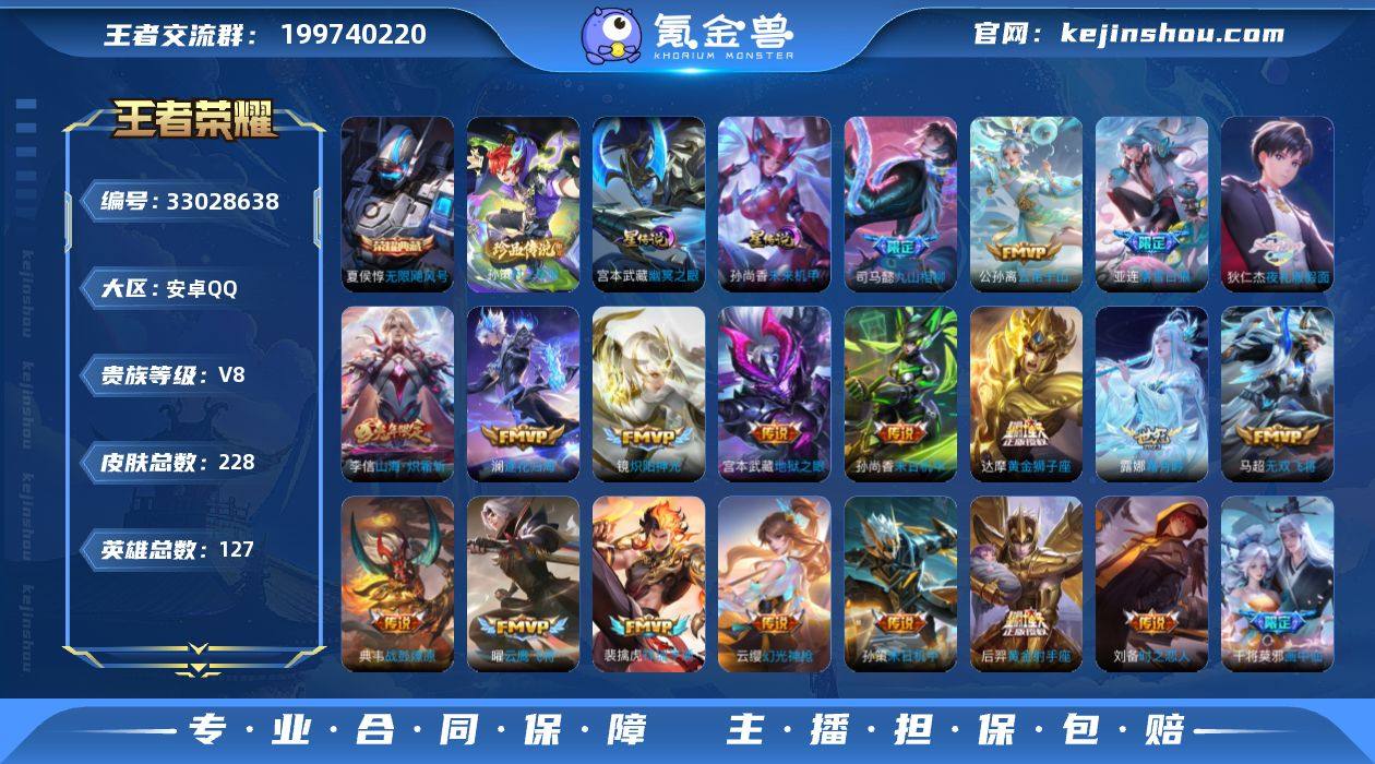 限飓风号·孙策时之奇旅·夜礼服假面·神骥赴朔漠·愿照山河定·落雪白狼·山海炽霜斩·影龙天霄·愿照九州拓·霜月吟·祥瑞亨通·九山相柳·无双飞将·紫悦宝·可二次】w22842-安卓Q-127英雄-228皮肤-8王者印记-180铭文-贵族积分8w【贵族8】【1典藏·1无双·1珍品·2星传说·36传说·46按键】【因赛季更新游戏段付以上号为准!】 【英雄全皮】:司马懿全皮,孙权全皮,敖隐全皮,司空震全皮,莱西奥全皮,戈娅全皮 【荣耀典藏】:夏侯惇无限飓风号 【无双皮肤】:孙悟空无相 【珍品传说】:孙策时之奇旅 【星元皮肤】:宫本武藏幽冥之眼,孙尚香未来机甲 【传说皮肤】:狄仁杰神骥赴朔漠,杨戬纵目迁山,曹操万灵伏威,司马懿九山相柳,公孙离云诺千山,司空震愿照山河定,澜愿照九州拓,云缨幻光神枪,裴擒虎祥瑞亨通,桑启鸣野蒿,亚连落雪白狼,典韦战鼓燎原,澜逐花归海,露娜霜月吟,狄仁杰夜礼服假面,兰陵王影龙天霄,宫本武藏惊梅引,亚瑟追逃游戏,干将莫邪画中仙,李信山海炽霜斩,吕布怒海麟威,孙尚香音你闪耀,马超无双飞将,孙策末日机甲,铠绛天战甲,镜炽阳神光,虞姬启明星使,孙悟空零号赤焰,曜云鹰飞将,刘备时之恋人,达摩黄金狮子座,后羿黄金射手座,孙尚香末日机甲,宫本...
