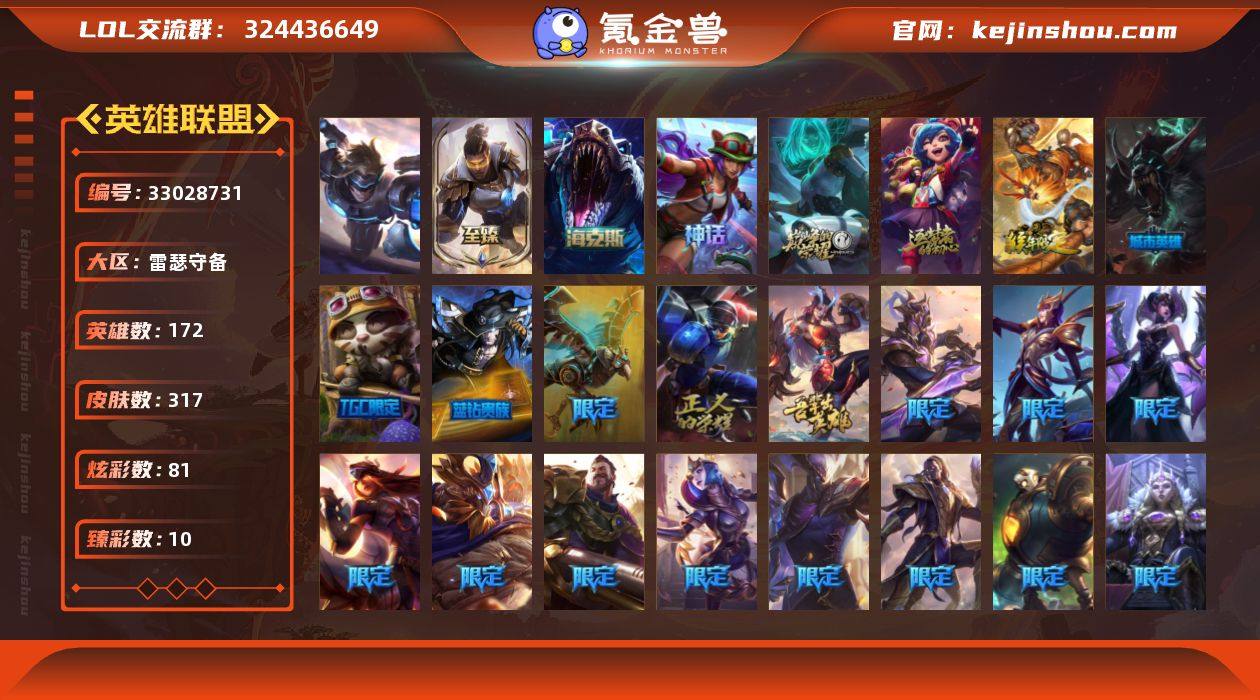 【LDC3133】172英雄/317皮肤/1终极/6神话/38限定/10臻彩/81炫彩/28传说/84史诗/未定级账号等级:569/卡特琳娜的匕首/10周年 安妮/源代码 乐芙兰/十五周年纪念 希维尔/10周年庆典 凤凰/至臻 未来战士 卢锡安/海克斯 雷克顿/无畏骑士 瑟庄妮 赤子初心/冠军典狱长 锤石 凯旋圣装/冠军之隐 劫 凯旋圣装/咖啡甜心 金克丝 核桃巴菲/泳池派对 奥莉安娜 优雅珠光鲸/霸天巨兽·雪崩 墨菲特/星之守护者 卡莎 热情之光/魔女 阿卡丽 虚荣/净雪之月 莫甘娜 冬虹/美猴王 孙悟空/龙马烈焰波比/幸福女神 乐芙兰/圣诞精灵 崔丝塔娜/圣诞糖果棒 厄运小姐/圣诞狂欢 时光/胡桃夹子 小丑/平安夜女神 娑娜/邪恶圣诞老人 维迦/冰雪节 茂凯/冬季仙境 发条/圣诞玩偶 波比/圣诞老人 酒桶/魄罗骑士 瑟庄妮/未来战士/S2 暗杀星 发条/S3 SKT T1 劫/S5 SKT T1 阿利斯塔/暗裔英雄 盖伦/胜利女神 伊莉丝/胜利女神 莫甘娜/胜利女神 希维尔/胜利之树 茂凯/胜利枪神 格雷福斯/胜利女神 奥莉安娜/胜利之剑 亚托克斯/胜利枪神 卢锡安/胜利机器人 布里茨/胜利女神 瑟庄妮/胜利剑圣 易/海贼 瑞兹/泳池派对 布隆/泳池派对 雷克顿/蓝色忧郁 崔斯特/密林猎手 提莫/暗影 沃里克/玉剑传说 舞龙卫/钢铁之翼 艾尼维亚/防暴天使...
