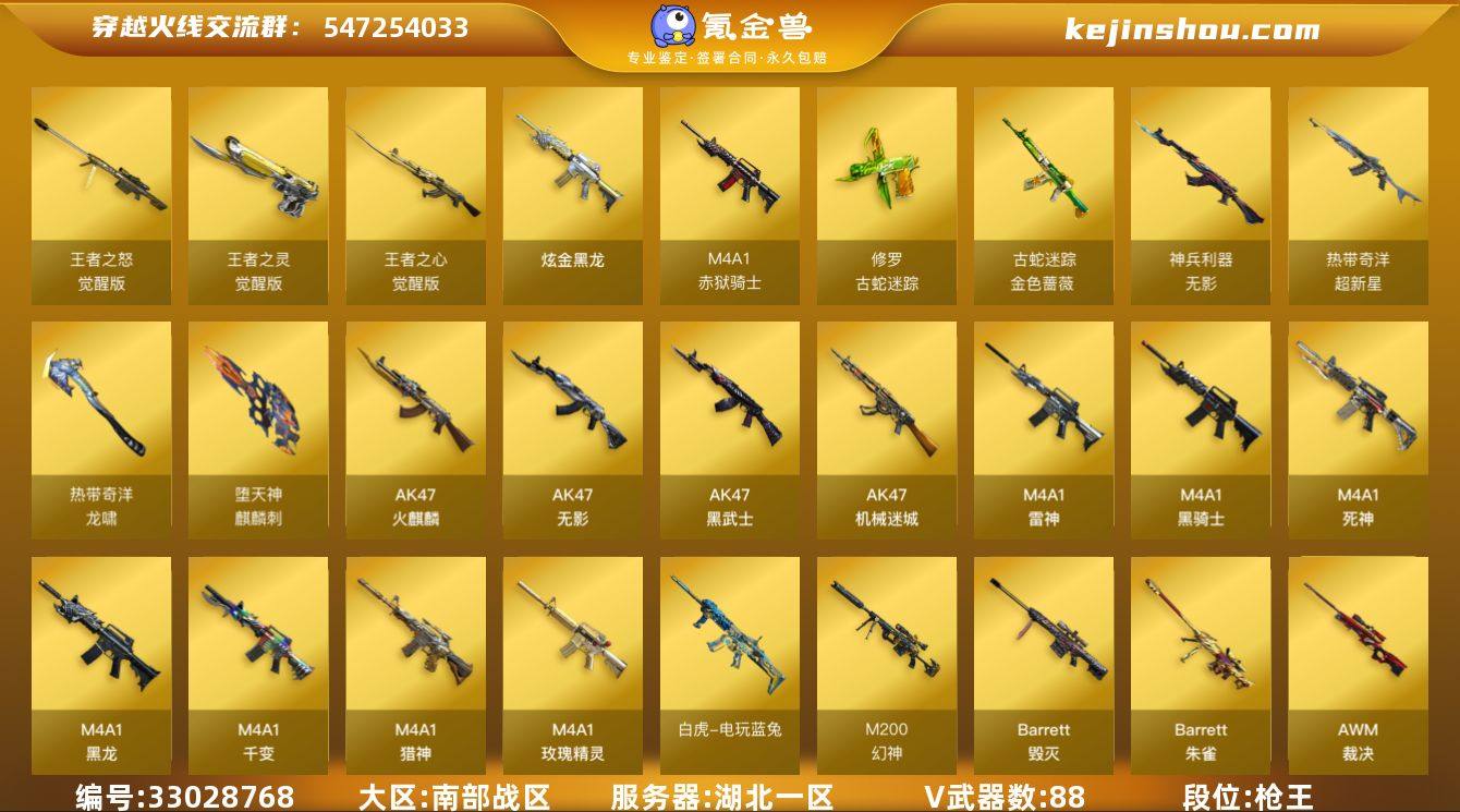【ky5935】湖北一区-90V-3王者武器数-1炫金武器数 【热门武器】:QBZ03-金色蔷薇,HK417-朱雀,M200-幻神,金色蔷薇-古蛇迷踪,修罗-古蛇迷踪,死亡之眼,白虎-电玩蓝兔,M4A1-黑骑士*2,汤姆逊-烈龙*6,RPK-盘龙*6,加特林-炼狱,斯泰尔-蝴蝶,沙鹰-修罗*2 【王者炫金武器】:炫金黑龙 【音效卡】:M4A1-黑骑士音效卡,Barrett-毁灭音效卡 【皮肤】:雷神-暗月,雷神-星空,火麒麟-平天大圣,火麒麟-心动糖果,毁灭-星空,毁灭-英雄计划 皮肤,M4A1-千变-孔明皮肤,黑骑士-暗月,战神-粉色甜心皮肤,战神-流金岁月皮肤,AK47-B-常胜将军-孙权,炼狱-玩具枪皮肤,修罗-能量核心,擎天-秘银 【角色】:零,智,战地猎狐,王者涂鸦,蛇隐宗,奇洋探员,初恋灵狐,风暴女,嘉年华灵狐,零-水下丽影,灵狐者-黄金海岸,灵狐者-职业经理,曼陀罗-礼服,潘多拉-X,潘多拉-甜心教官,蛇姬,斯沃特-X,蜀雪,铁骑荣耀 【人偶武器】:天龙-曼陀罗,斯泰尔-蝴蝶,迷你地狱终结者,AWM-灵狐-15周年嘉年华,COP-旗袍,迷你深渊冰龙,夺魂,迷你生化手雷,生化手雷-机甲核心,迷你超能女侍,迷你巨石泰坦-魔花研究所,灵狐娃娃手雷 【暴走生化】:死亡之眼 【挑战大师】:冰龙粉碎者-白马银...