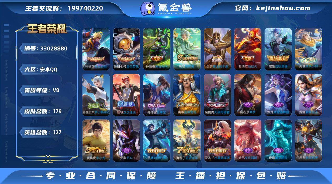 安卓Q-V8-至尊星耀IV段位-126英雄-179皮肤-2典藏皮肤-5传说-47史诗 【荣耀典藏】:孙悟空全息碎影,鲁班七号星空梦想 【传说皮肤】:桑启鸣野蒿,虞姬启明星使,后羿黄金射手座,孙尚香末日机甲,孙悟空地狱火 【限定皮肤】:姜子牙天穹之誓,狄仁杰阴阳师,赵云皇家上将,孙尚香蔷薇恋人,鲁班七号狮舞东方,高渐离玩趣恶龙,元歌无心,夏侯惇朔风刀,典韦蓝屏警告,狄仁杰魔术师,狄仁杰万华元夜,达摩沙漠行僧,项羽海滩派对,老夫子醍醐杖,程咬金演武夺筹,兰陵王金庭之子,孙悟空至尊宝,牛魔御旌,李元芳云中旅人,虞姬启明星使,钟馗神迹守卫,钟馗驱傩正仪,女娲朔望之晖,鬼谷子原初探秘者,鬼谷子五谷丰年,苏烈千军破阵,弈星混沌棋,沈梦溪大漠名商,明世隐疑决卦,裴擒虎天狼狩猎者,裴擒虎李小龙,裴擒虎擒涛扼浪,米莱狄御霄,盾山御銮,上官婉儿梁祝,鲁班大师探海日志,桑启海盐诗旅,张良古海寻踪,鬼谷子天穹祈灯,刘邦剑破天穹 【赛季限定】:米莱狄御霄,牛魔御旌,盾山御銮,夏侯惇朔风刀,弈星混沌棋,明世隐疑决卦,老夫子醍醐杖,鬼谷子原初探秘者,狄仁杰万华元夜,程咬金演武夺筹,钟馗驱傩正仪,苏烈千军破阵,达摩沙漠行僧,兰陵王金庭之子,沈...