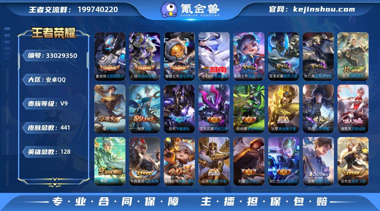 实名: 不可修改 贵族等级: V9 英雄数: 128 皮肤数: 441 荣耀水晶: 星空梦想,无限飓风号,银白咏叹调 珍品传说: 怪盗基德 星传说: 幽冥之眼,星际治安官,寅虎·焰心 传说皮: 黄金狮子座,黄金射手座,冠军飞将,黄金白羊座,久胜战神,一念神魔,末日机甲-孙尚香,音你心动-小乔,地狱之眼,李逍遥,乞巧织情,时之恋人-刘备,超时空战士-狄仁杰,挚爱之约,神树通天 限定皮: 冰锋战神,遇见飞天,李小龙,游园惊梦,梁祝,御风骁将,引擎之心,魔法小厨娘,辉光之辰,天魔缭乱,蜜橘之夏,乒乒小将,太华,青春决赛季,天狼狩猎者,冰霜恋舞曲,逐梦之影,逐梦之光,神奇女侠,天狼绘梦者,青龙志,瑞麟志,梅西,至尊宝,一生所爱,武陵仙君,大圣娶亲,寅虎·瑞焰,霸王别姬-项羽,高山流水,孙行者,匿光追影者,傲雪梅枪,玉兔公主,五谷丰年,鸣野蒿,逐霄战戟 亮点: 【精品号手慢无】需要消耗任意点券恢复V9!个性按键4 亲密玫瑰500+ 积分夺宝25