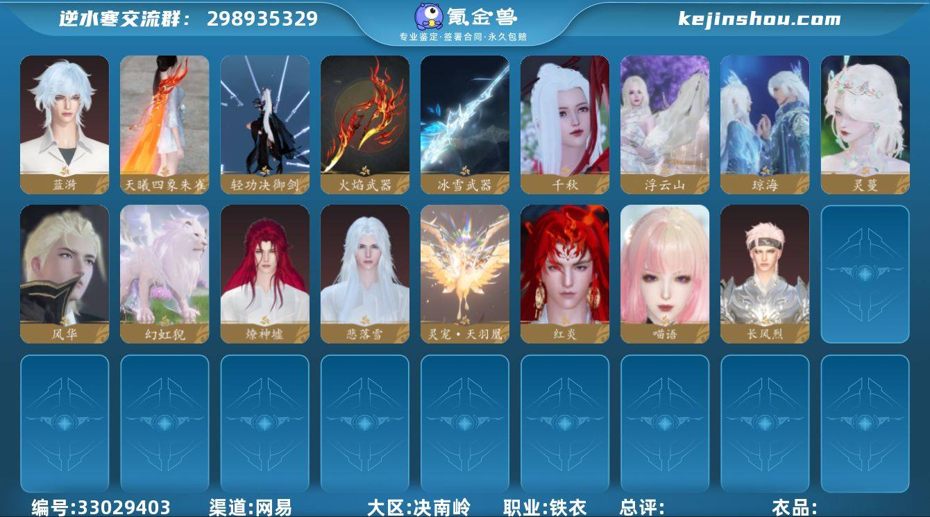 【已用天赏41-1转盘】【4.10号换绑】战力值:1843749 总评:1843749 角色等级:89 衣品值: 320885 国色值: 161900 已用天赏石:42 天霓染数量:10 【网易邮箱账号】 【有换绑冷却】 【铁衣】 【男】 【7级】 【卧看千山】 【互通】 转盘外观1 副本外观5 天赏外观16 天赏祥瑞1 天赏灵宠1 武器环身4 转盘外观:长风烈; 副本外观:白夜拂雪,紫宿宸极,星剑分野,霜途无间,飞焰流波; 天赏外观:雾境,风华,蓝漪,燎神墟,灵蔓,悲落雪,琼海,浮云山,千秋,红炎,喵语,火焰武器,冰雪武器,星辰武器,轻功诀御剑,烁风; 天赏祥瑞:幻虹猊; 天赏灵宠:灵宠·天羽凰; 武器环身:银甲霜锋,振金雷,谪仙雷剑,天魔蛊主;