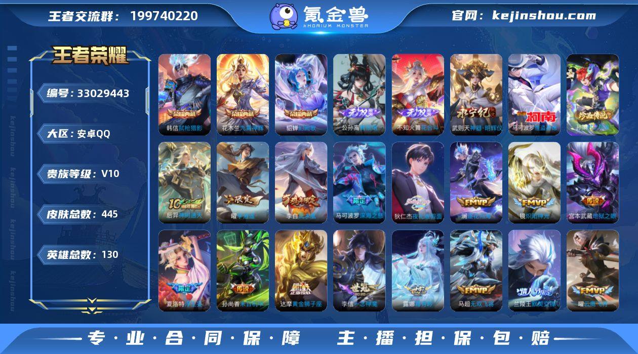 【万战省标上官婉儿 省标干将莫邪 v10 445皮 4典藏 武则天 韩信 貂蝉 花木兰 3无双 公孙离 不知火舞 武则天 2珍品传说 孙策 马可波罗 52传说 4星传说】实名: 可修改 贵族等级: V10 英雄数: 130 皮肤数: 445 荣耀水晶: 武则天,九霄神辉,幻阙歌,弑枪猎影 无双皮: 神器·明辉仪,花合斗,离恨烟 珍品传说: 怪盗基德,时之奇旅-孙策 传说皮: 黄金狮子座,黄金射手座,云鹰飞将,绛天战甲,久胜战神,炽阳神光,一念神魔,末日机甲-孙尚香,仲夏夜之梦,零号·赤焰,地狱之眼,音你心动-周瑜,李逍遥,乞巧织情,时之恋人-刘备,游龙清影,淬星耀世,超时空战士-狄仁杰,末日机甲-孙策,无双飞将,神器·明辉仪,燃星之曲,画中仙,浮生妄,记忆之芯,百相守梦(张飞),追逃游戏(亚瑟),追逃游戏(安琪拉),鹤羽星尊,灼幽烈阳,妄想实况,惊梅引,遇见神鼓,永恒水手月亮,夜礼服假面,霜月吟,澜逐花归海,艾琳觅芳踪,牧神诗旅,玄雷天君,幻光神枪,祥瑞亨通,神树通天 限定皮: 遇见飞天,李小龙,梁祝,引擎之心,武圣,岱宗,神威,时之彼端,飞衡,逐梦之音,凤求凰,美猴王,瑞麟志,朱雀志,凤凰于飞,至尊宝,默契交锋-兰陵王,大圣娶亲,高山流水,女儿国国王,傲雪梅枪,深海之息,唐三藏,五谷丰年,诗剑行,山海·玄木吟,山海·碧波行,齐天大圣,影龙...