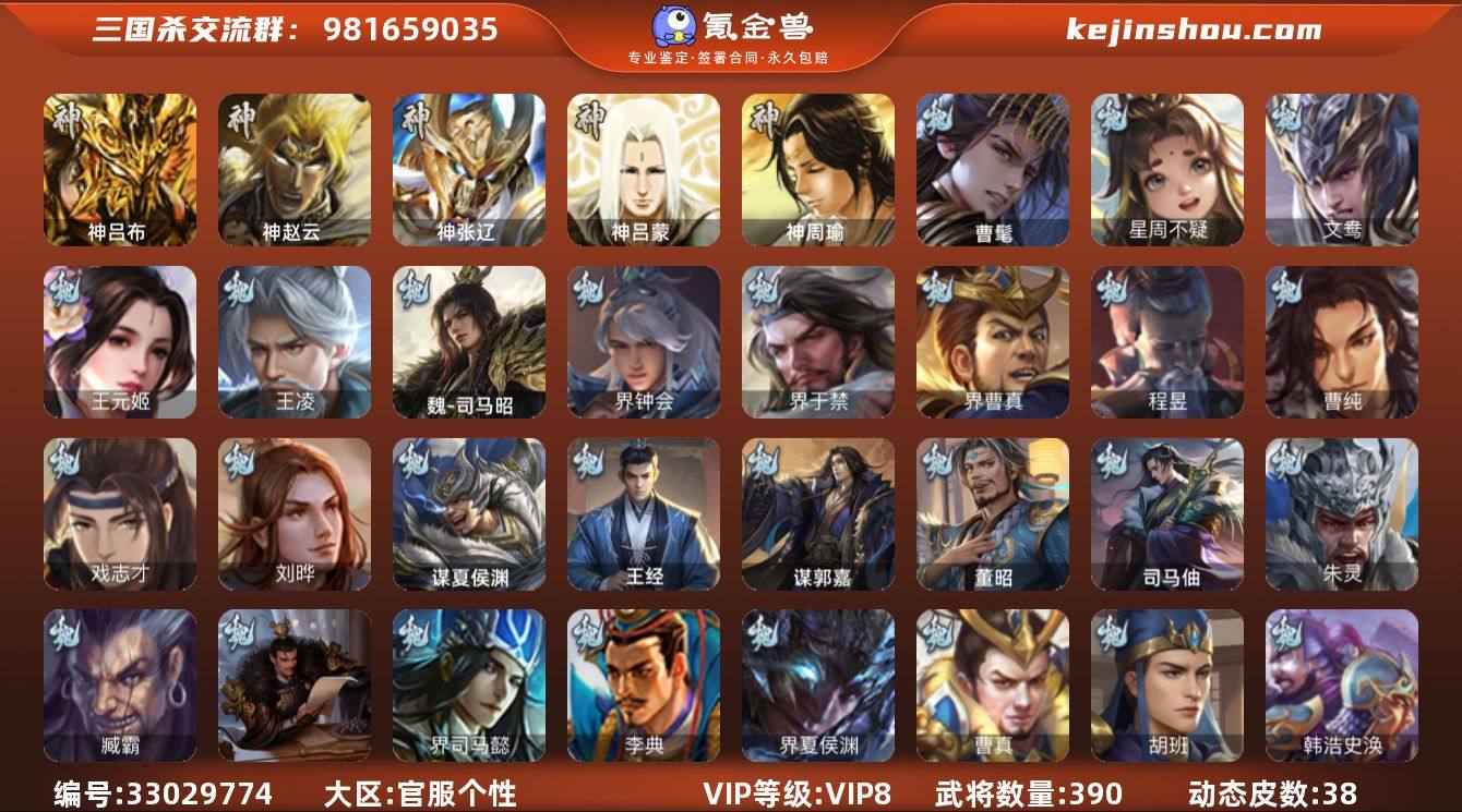 VIP等级: VIP8 官阶: 大将军 武将数量: 390 动态皮肤数量: 38 神将: 神吕布,神张辽,神赵云,神吕蒙,神周瑜 魏国武将: 刘晔,戏志才,曹纯,程昱,界曹真,界于禁,界钟会,魏-司马昭,王凌,王元姬,文鸯,唐咨-魏,张辽,SP蔡文姬,SP关羽,SP贾诩,SP姜维,SP庞德,卞夫人,蔡贞姬,曹昂,曹操,曹冲,曹洪,曹丕,曹仁,曹叡,贾逵,王异,张恭,鲁芝,界满宠,界曹植,满宠,荀攸,王基,钟繇,蒯越蒯良,郭嘉,荀彧,阮慧,杜畿,界郭嘉,崔琰,界曹丕,界荀彧,朱灵,界甄姬,吕虔,界陈群,界王异,界许褚,界郭淮,华歆,陈群,界邓艾,界典韦,界曹休,袁涣,李通,乐进,辛宪英,郭淮,毛玠,郭皇后,毌丘俭,夏侯惇,曹植,司马朗,谋于禁,界曹操,星周不疑,许褚,界张辽,谋徐晃,张郃,钟会,文聘,曹彰,界夏侯惇,诸葛诞,司马懿,甄姬,界徐晃,徐晃,韩浩史涣,胡班,曹真,典韦,界夏侯渊,谋荀彧,夏侯渊,李典,于禁,邓艾,界司马懿,孟达-魏,臧霸,朱灵(国战),曹髦,司马伷,董昭,谋郭嘉,王经,谋夏侯渊 蜀国武将: 董允,花鬘,界黄忠,谯周,沙摩柯,王平,赵襄,周群,诸葛瞻,谋马超,谋赵云,蜀-谋孙尚香,徐庶,界魏延,杨仪,吕凯,界关羽,界诸葛亮,邓芝,界伊籍,费祎,严颜,界黄月英,界张嶷,赵云,张松,彭羕,李丰,界刘备,界刘禅,刘封,糜竺,李遗,谋庞统,黄月英,刘巴,关羽,...