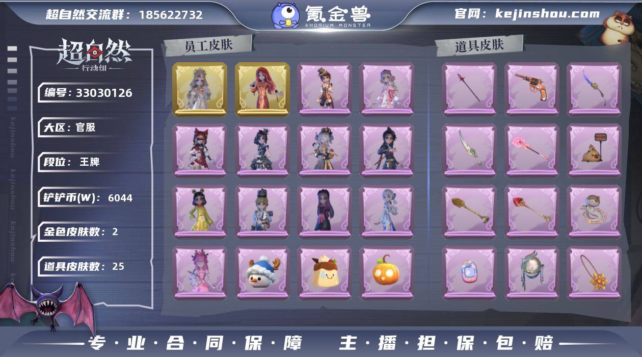 金皮2;紫皮11;道具皮25;皮肤:薇薇安-圣光之谕,巫铃儿-镜花辞,爱丽丝-甜梦派对,莉莉-情公主,逍遥-绣春逍影,爱丽丝-丝缕哀歌,小黄-异色序曲,阿念-庆宴绮愿,小黄-呱呱雨衣,巫铃儿-素影瑶光,莉莉-除妖小师妹,阿念-王子与骑士,莉莉-莓果陷阱;道具:音响-happy猫,刺刀-碧络琅环,摸金符-祝祷词,传送按钮-幻宠之门,喷气背包-乘风溯雪,音响-鸣沙鼓,长枪-罪棘,转轮手枪-新星时代,黄牛能量饮料-青玉抱丹,额外的背包-飞花令,腰包-宝剑八,铲子-龙鳞,刺刀-紫气东来,长鞭-小狗蛇点点鞭,铲子-赞萌波板糖,腰包-惊魂娃娃,摸金符-花落精绝,短管猎枪-星光的裁决,夜视仪-心跳眼镜,夜视仪-金丝眼镜,铲子-卡皮巴拉小黄豚铲,黄牛能量饮料-珍珠芭乐莓莓,急救包-蔷薇物语,传送按钮-昆仑镜,铲子-圣心之泪;美妆:美妆-暗夜小恶魔;饰品:头饰-萨卡班甲鱼头套,头饰-樱桃奶油布丁,头饰-卑微头套,头饰-哈士奇头套,头饰-雪墩墩头套,头饰-精致露比头套,头饰-呆滞头套,头饰-烈焰红唇头套,头饰-惊魂南瓜头套,头饰-炙热烧烤,头饰-鱼头怪头套,头饰-嘻嘻头套,头饰-小财神豚豚头套,头饰-小狗蛇点点头套,头饰-大葱明头套,头饰-滑稽头套,头饰-面具马头套,头饰-火爆了头套,头饰-像素朋克墨镜,头饰-后室幸存者头套,...