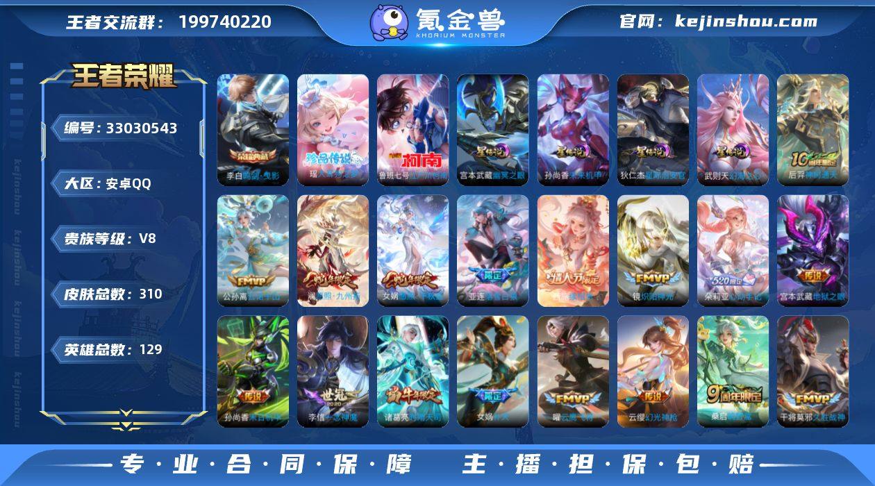 安卓Q-V8-最强王者段位-129英雄-310皮肤-1典藏皮肤-1典藏英雄-2珍品传说-25传说-106史诗 【英雄全皮】:敖隐全皮,空空儿全皮 【荣耀典藏】:武则天英雄,李白鸣剑曳影 【珍品传说】:瑶大耳狗之梦,鲁班七号江户川柯南 【传说皮肤】:后羿神树通天,公孙离云诺千山,西施续相思,女娲愿照千秋盛,澜愿照九州拓,云缨幻光神枪,桑启鸣野蒿,朵莉亚心动手记,亚连落雪白狼,东皇太一灼幽烈阳,项羽无限倾心,孙悟空齐天大圣,女娲补天,诸葛亮时雨天司,镜炽阳神光,虞姬启明星使,曜云鹰飞将,李信一念神魔,刘备时之恋人,干将莫邪久胜战神,孙尚香末日机甲,宫本武藏地狱之眼,孙悟空地狱火,武则天海洋之心,狄仁杰超时空战士 【限定皮肤】:暃埋骨钱,蒙犽顽岩魄,大乔绒语心约,姜子牙天穹之誓,狄仁杰阴阳师,赵云皇家上将,嬴政优雅恋人,庄周高山流水,高渐离玩趣恶龙,钟无艳王者之锤,孙膑天狼运算者,芈月白晶晶,芈月幻夜卜梦,元歌云间偶戏,元歌无心,马可波罗山海玄木吟,狄仁杰魔术师,狄仁杰万华元夜,达摩星际陆战队,达摩沙漠行僧,项羽海滩派对,项羽无限倾心,老夫子醍醐杖,关羽冰锋战神,程咬金演武夺筹,韩信傲雪梅枪,兰陵王金庭之子,花木兰青春决...